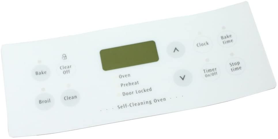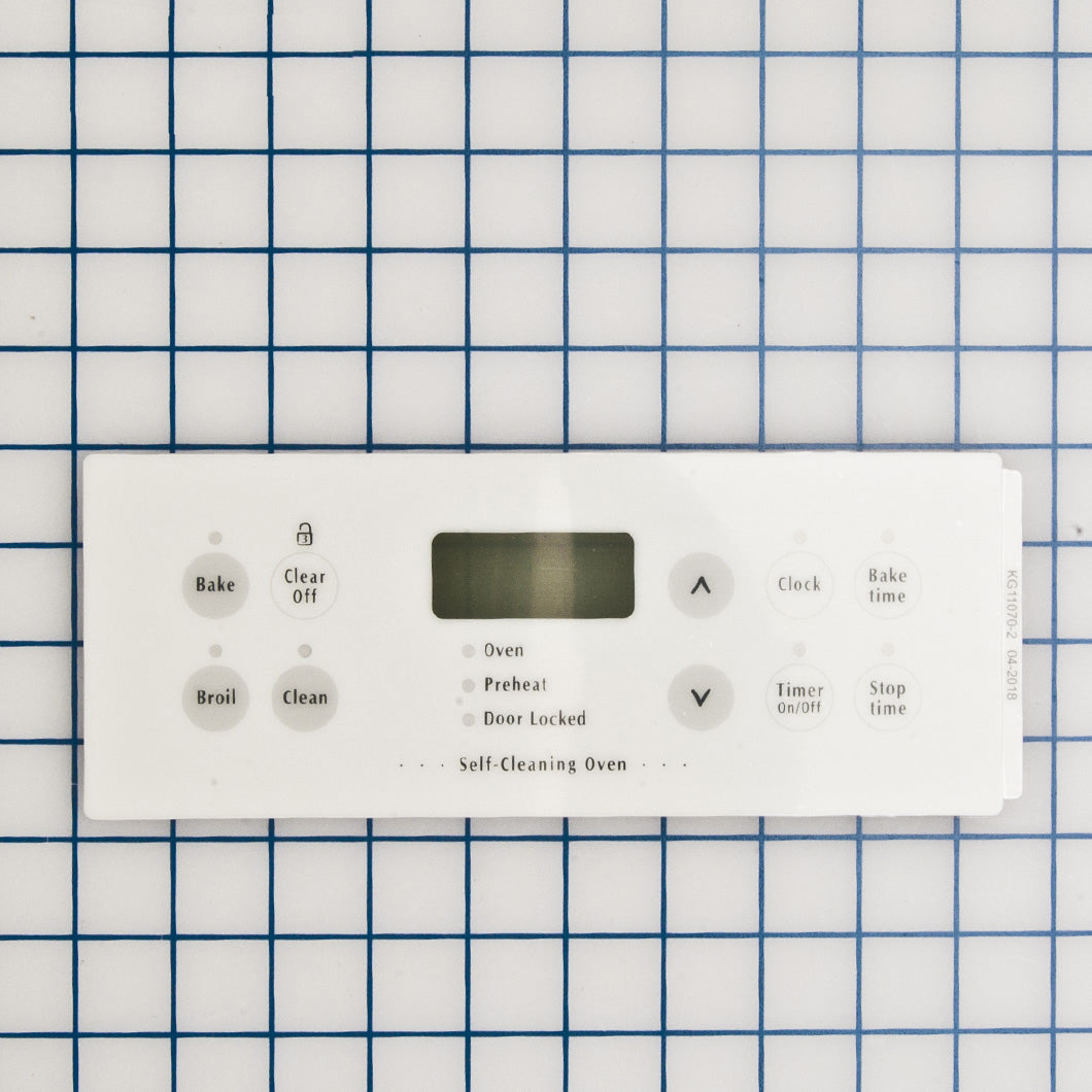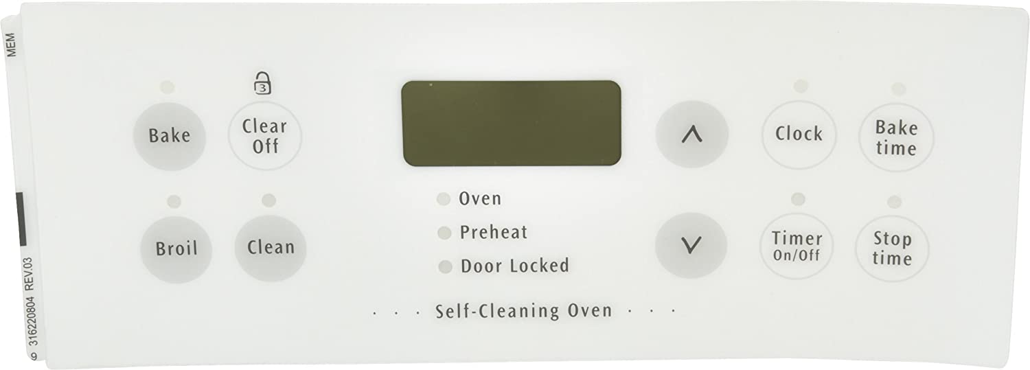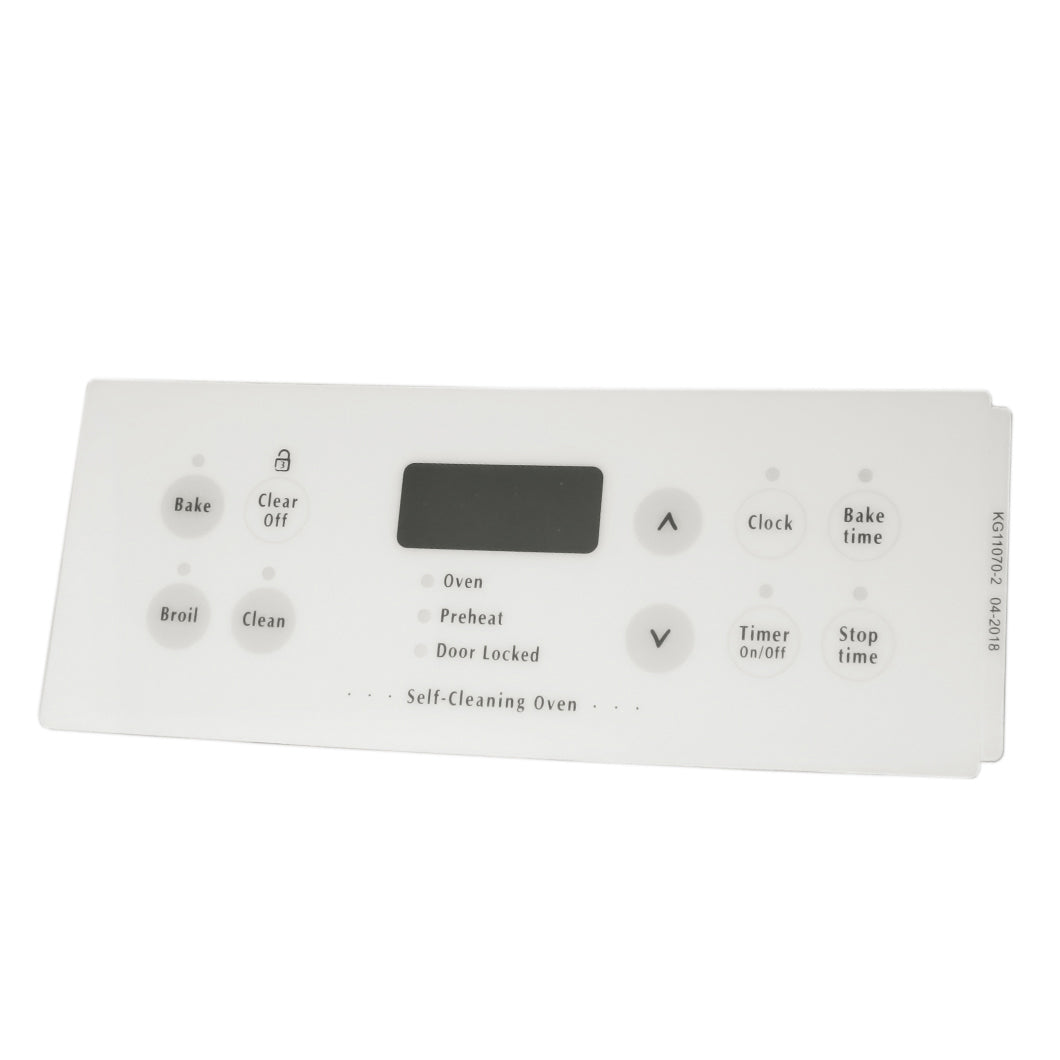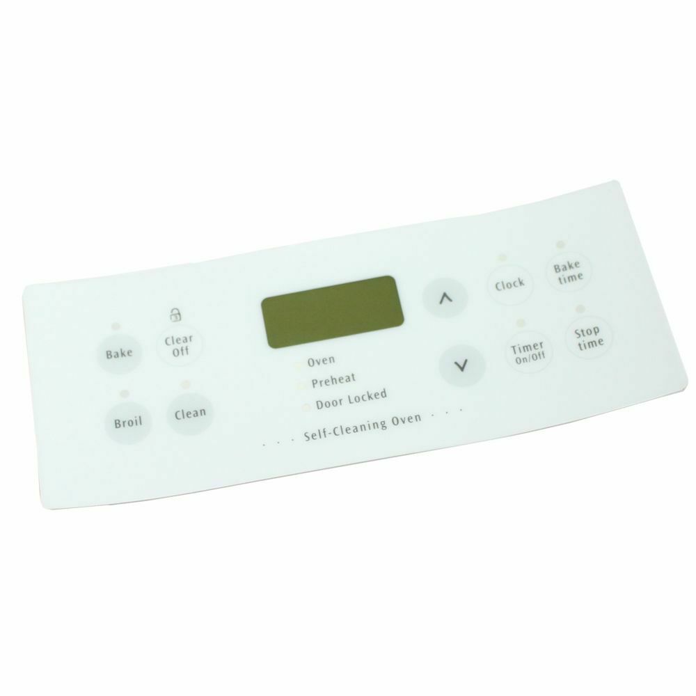 Replacement control overlay used on some Frigidaire, Kelvinator, Kenmore, and Westinghouse range models.