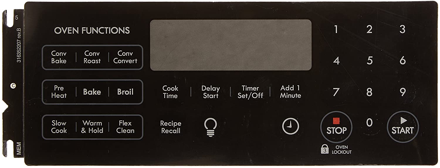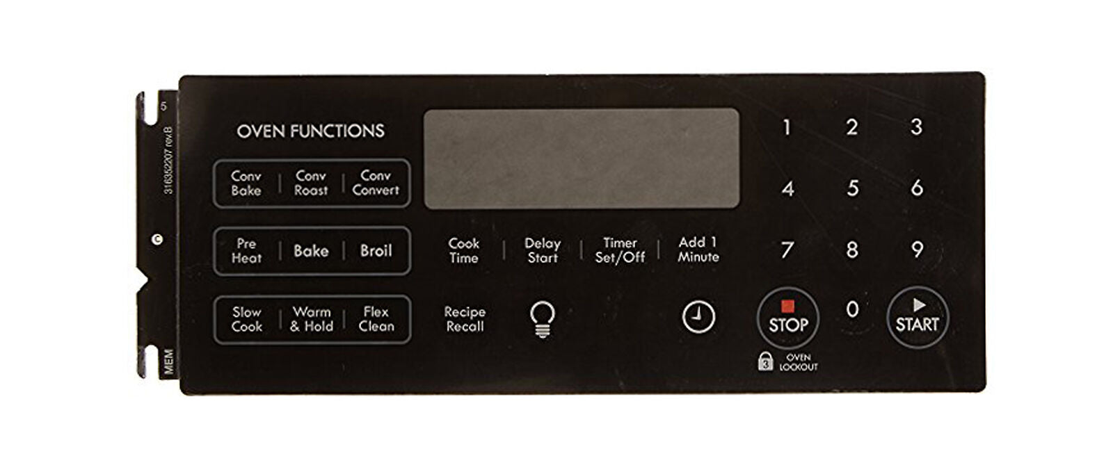 Replacement control overlay used on some Frigidaire and Kenmore range models.
