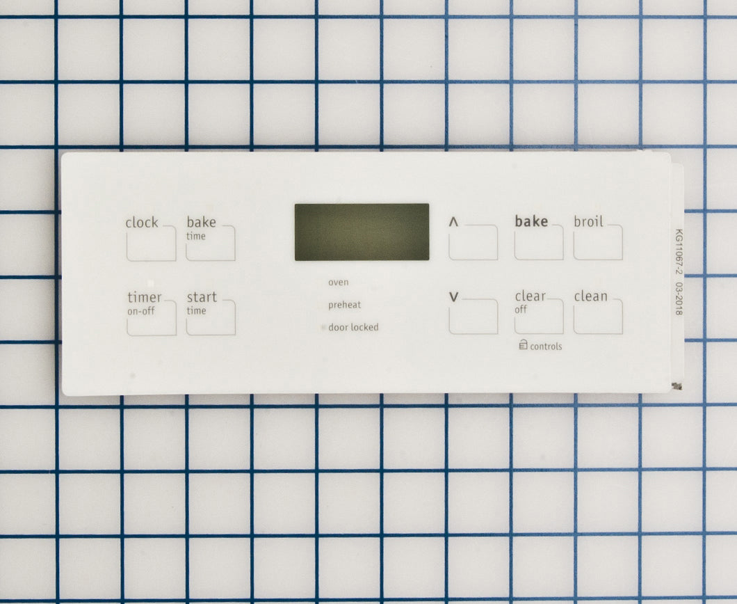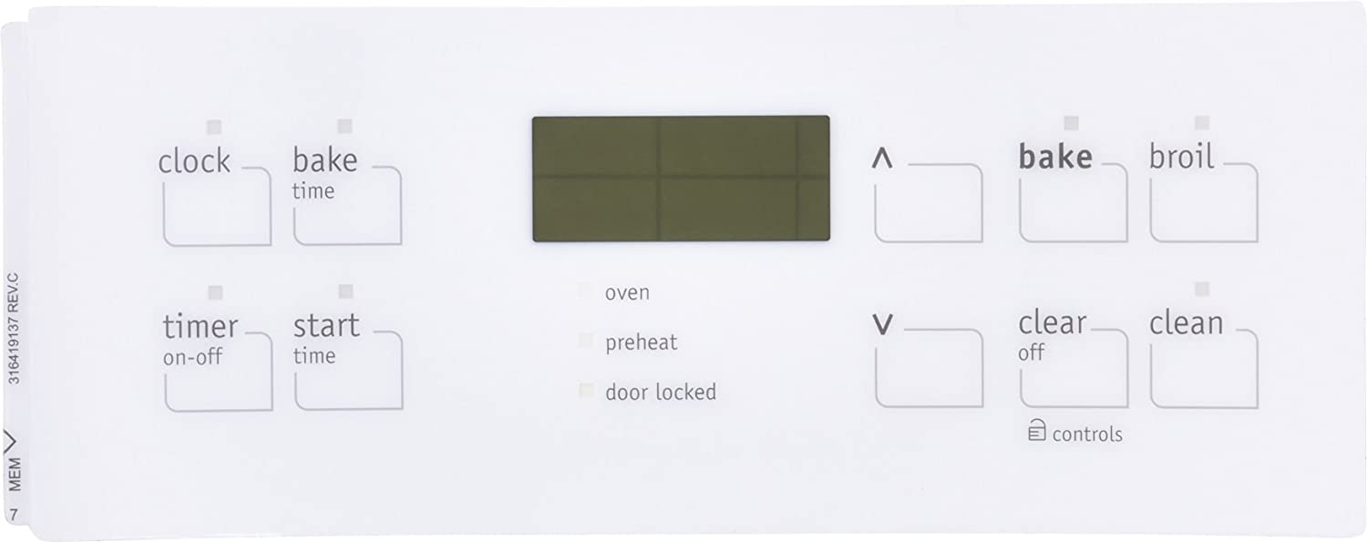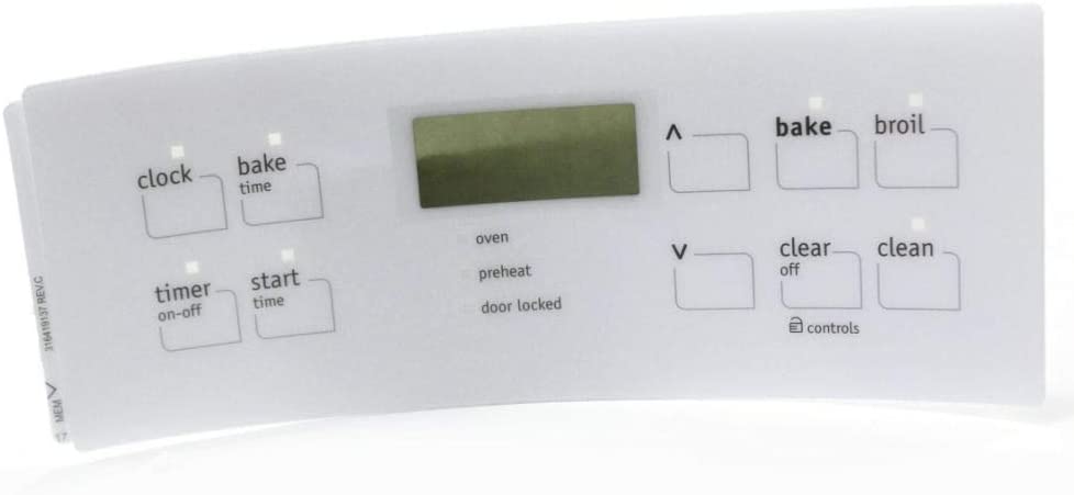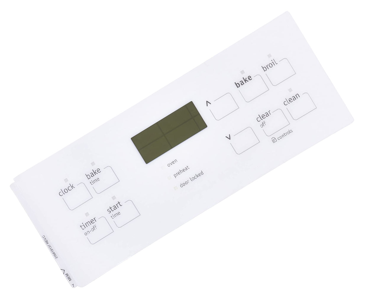 Replacement control overlay used on some Crosley, Frigidaire, Kelvinator, Kenmore, and Westinghouse range models.