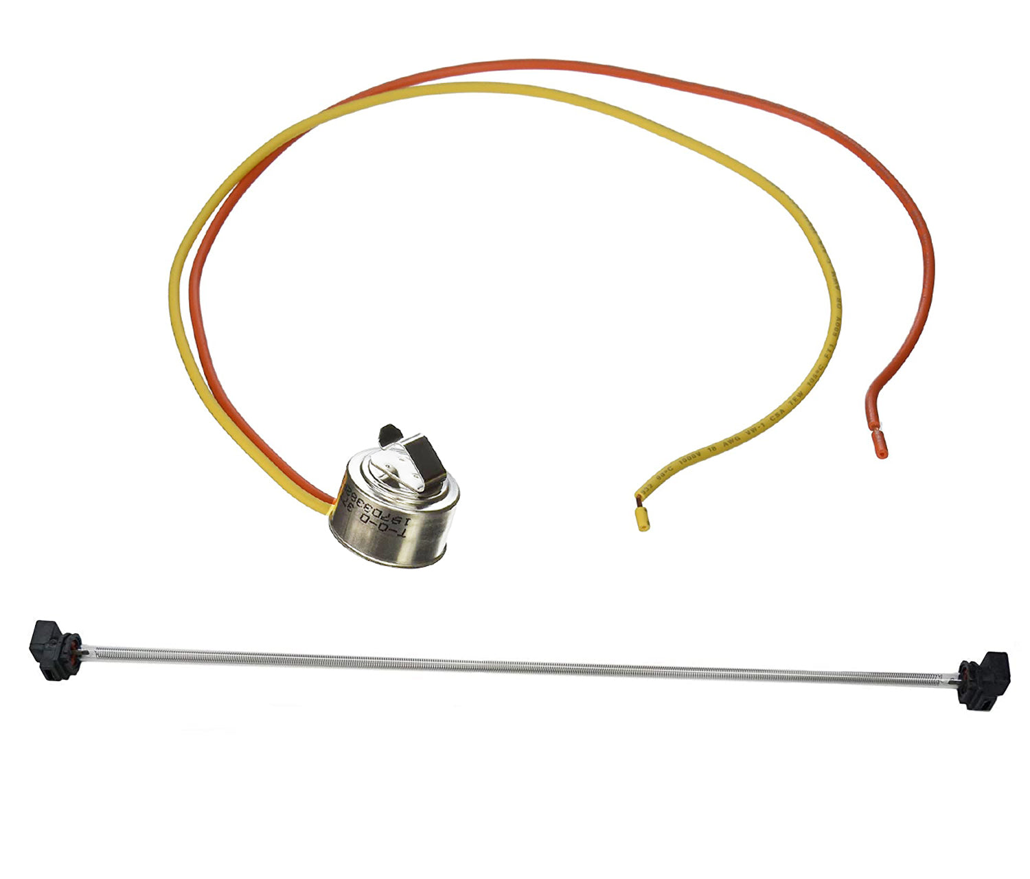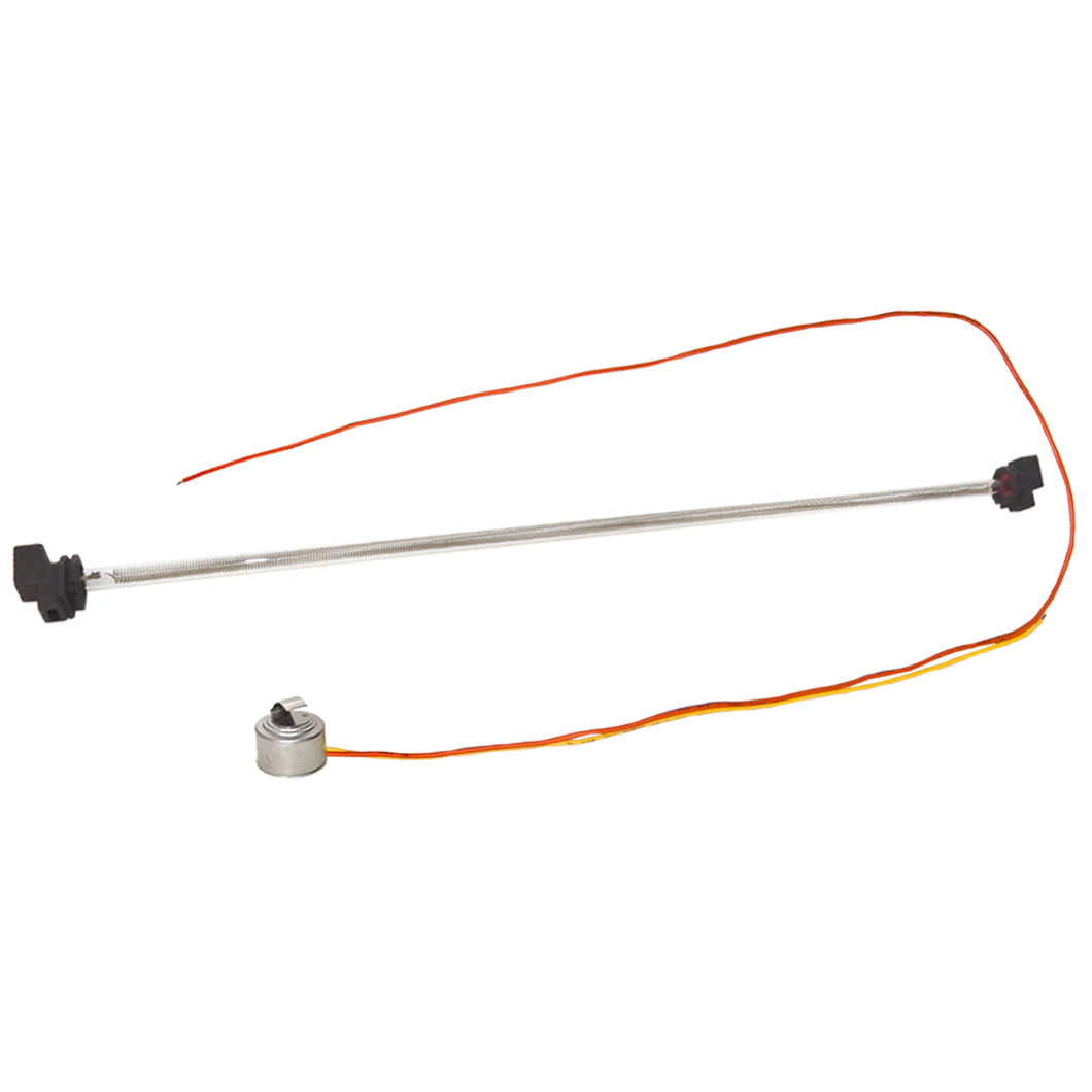 Replacement defrost heater and thermostat used on some Americana, GE, and Hotpoint refrigerator models.