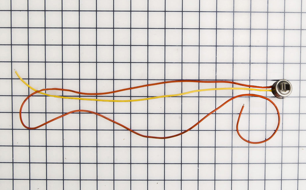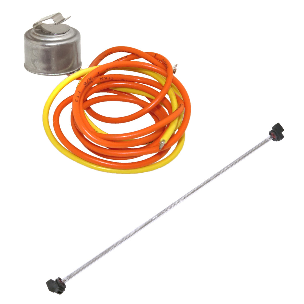 Replacement defrost heater and thermostat used on some Americana, GE, and Hotpoint refrigerator models.
