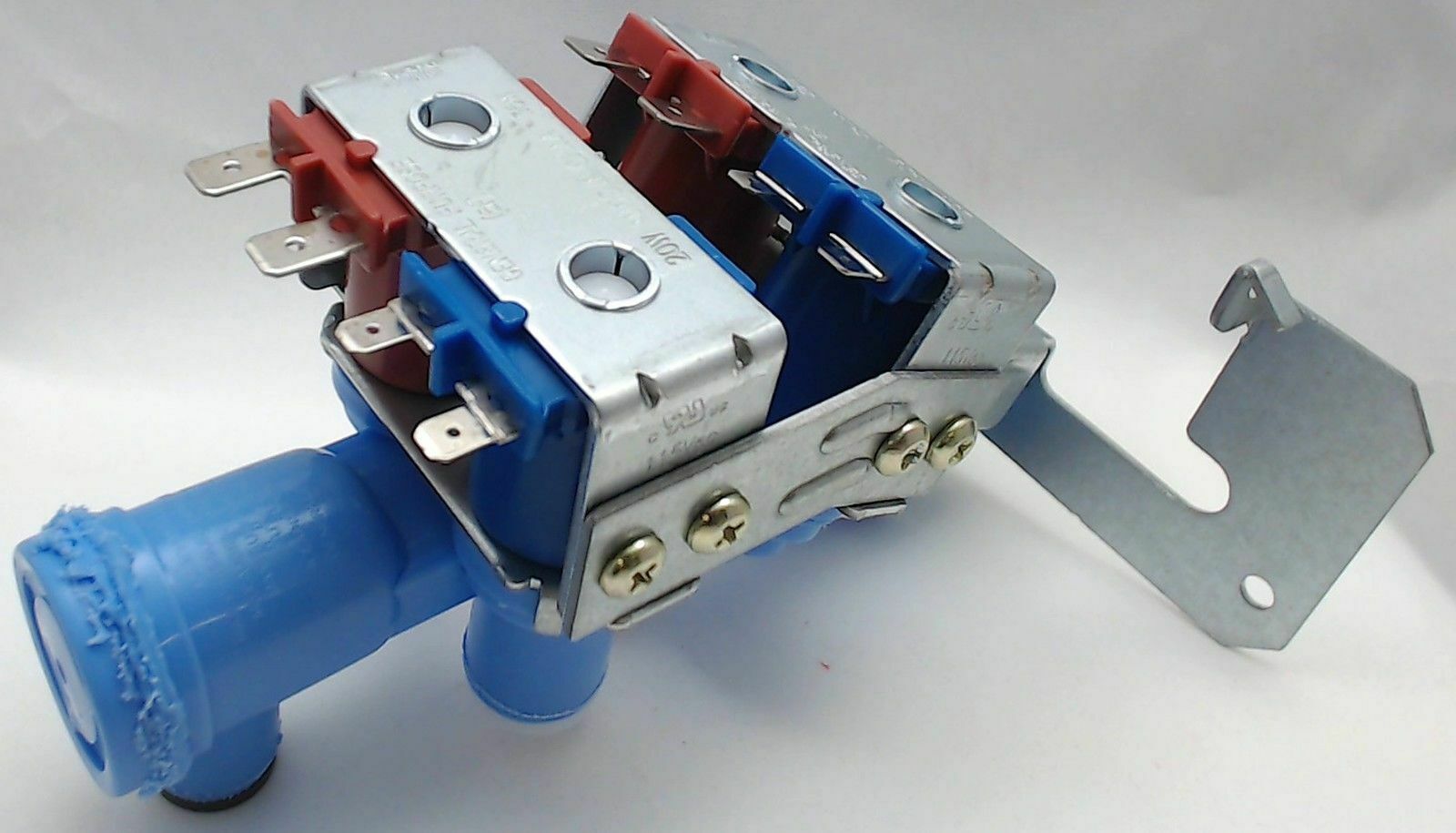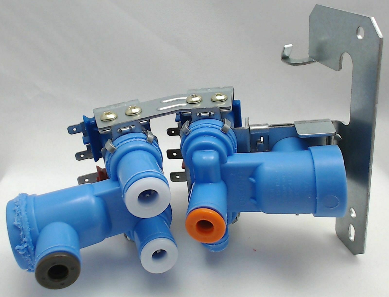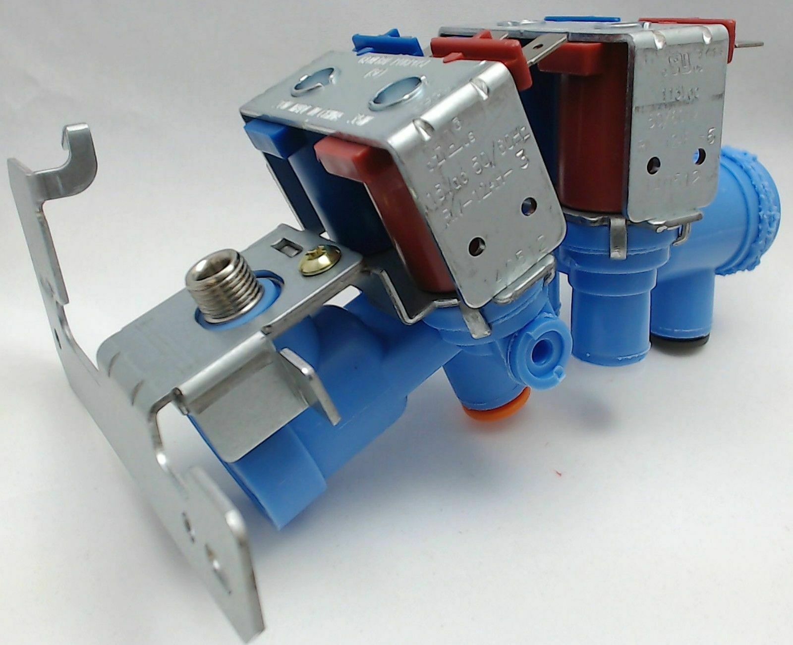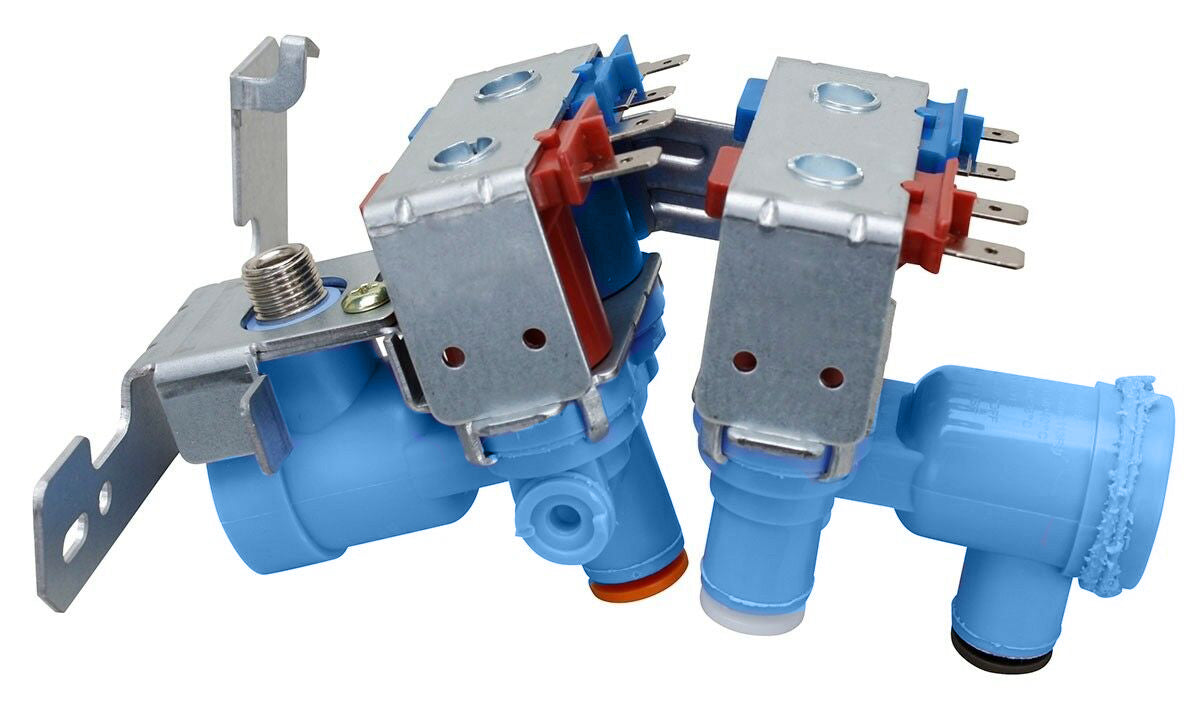 Replacement water valve used on some GE, Hotpoint, and Kenmore refrigerator models.