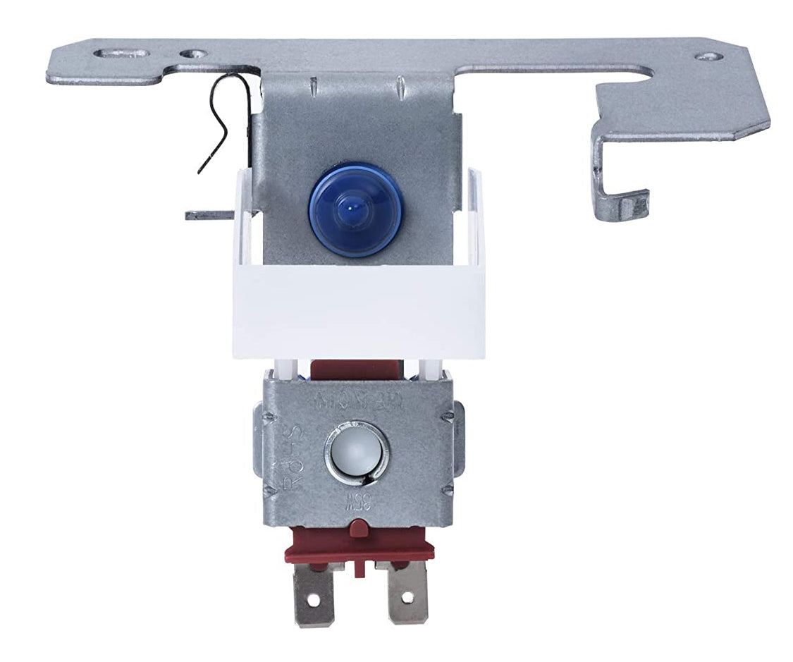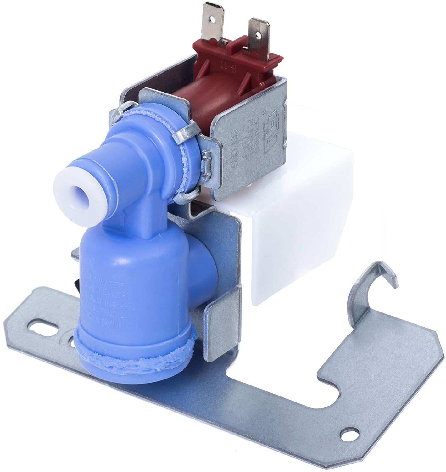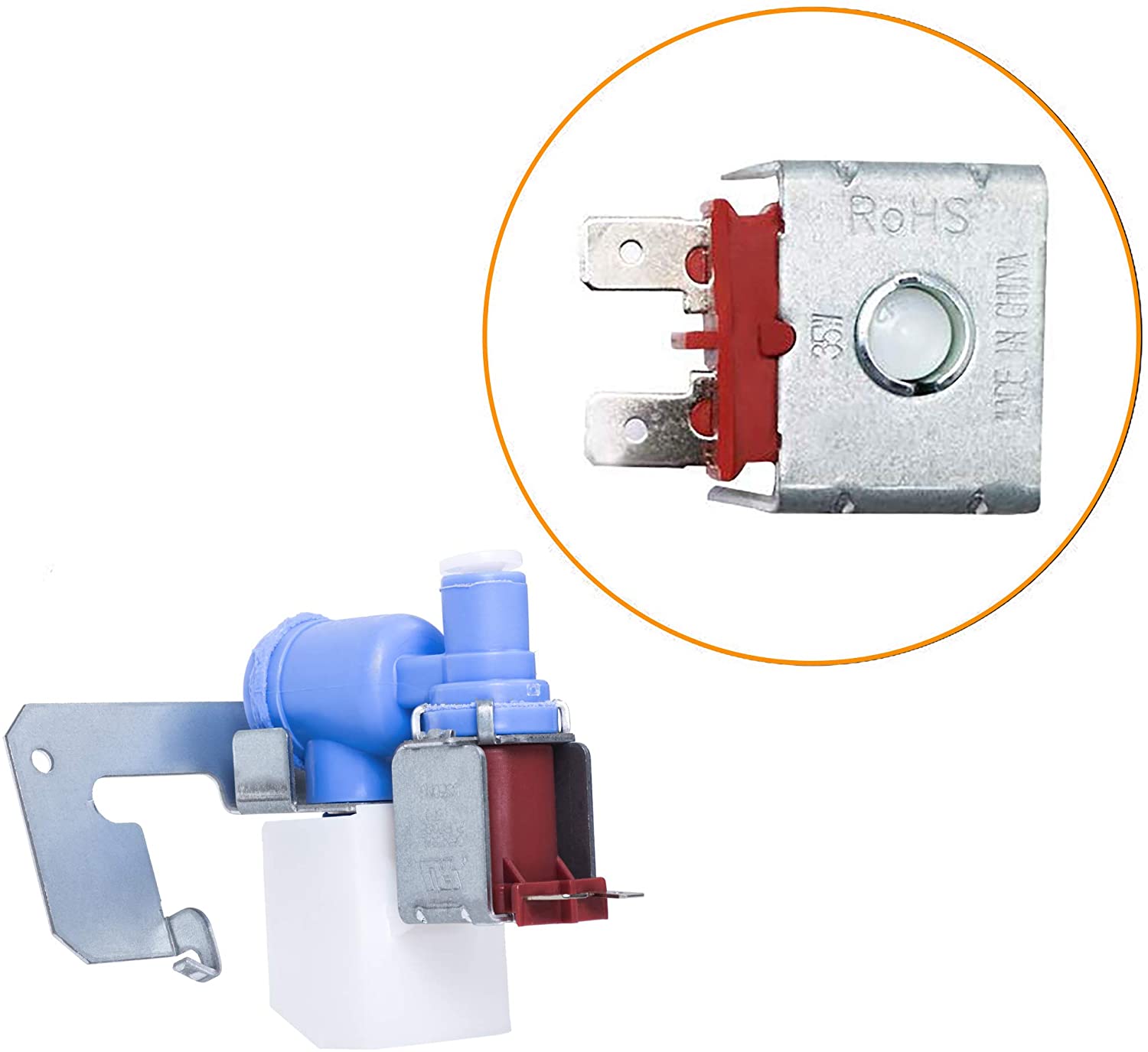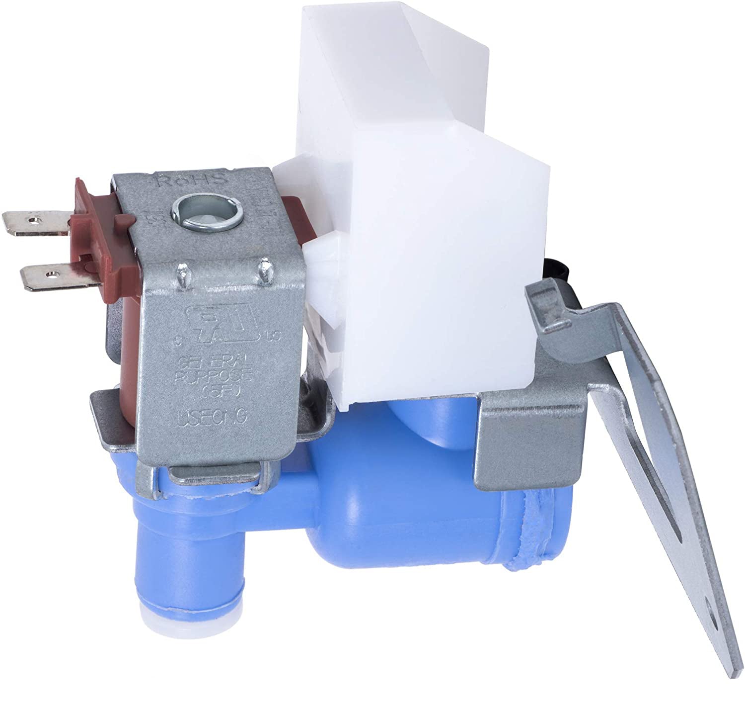 Replacement water inlet valve used on some GE, Hotpoint, and Kenmore refrigerator models.