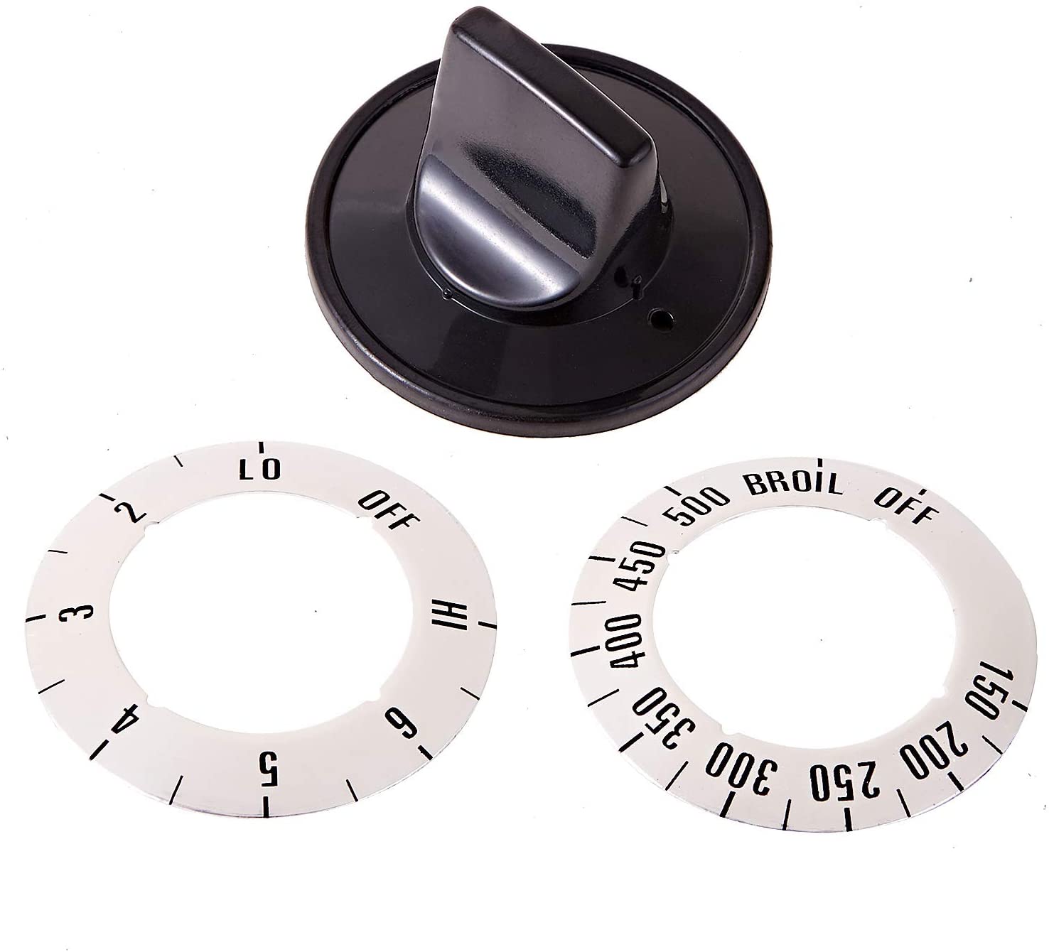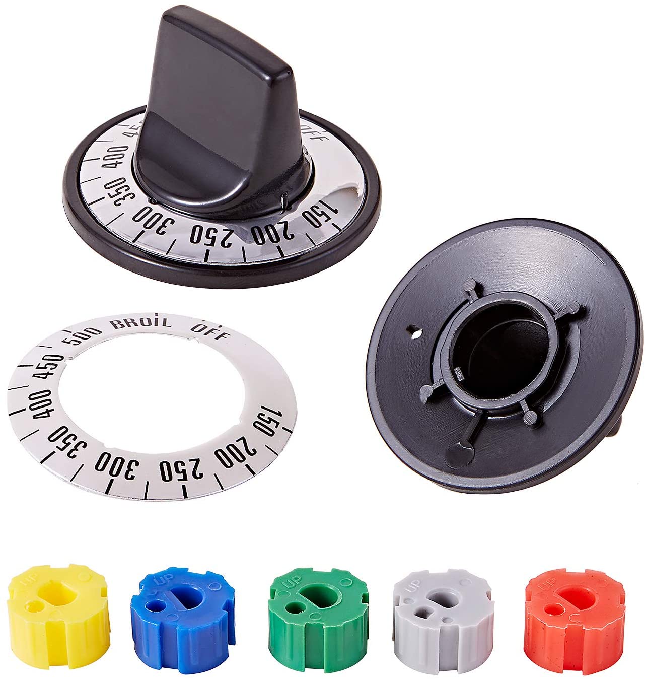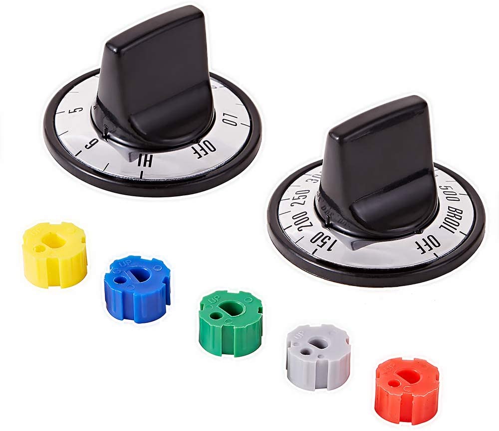 - Electric Stove Knobs KN002 Package Includes: Includes 5 x Knob; 5 x Yellow/Green/Red/Blue/Gray Inserts (each color 5pcs); 4 x Surface Inlay CCW; 4 x Surface Inlay CW; 1 x CW to ON Inlay;1 x Thermostat Inlay 150 degree - 500 degree w/broil.
