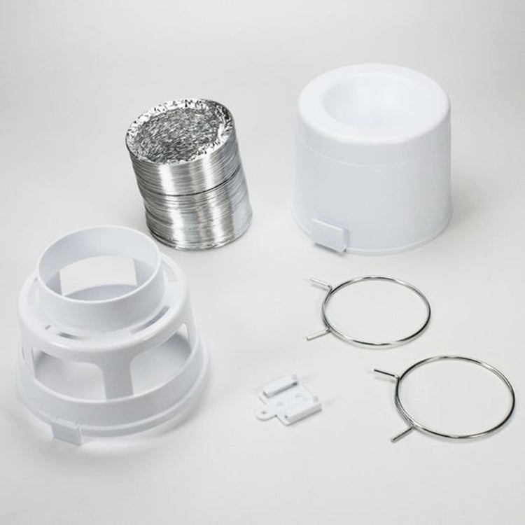 - Includes: (1) 4″ Lint Trap, (1) 4″ x 5′ Flex Duct, (2) 4″ Galvanized Tension Clamps.