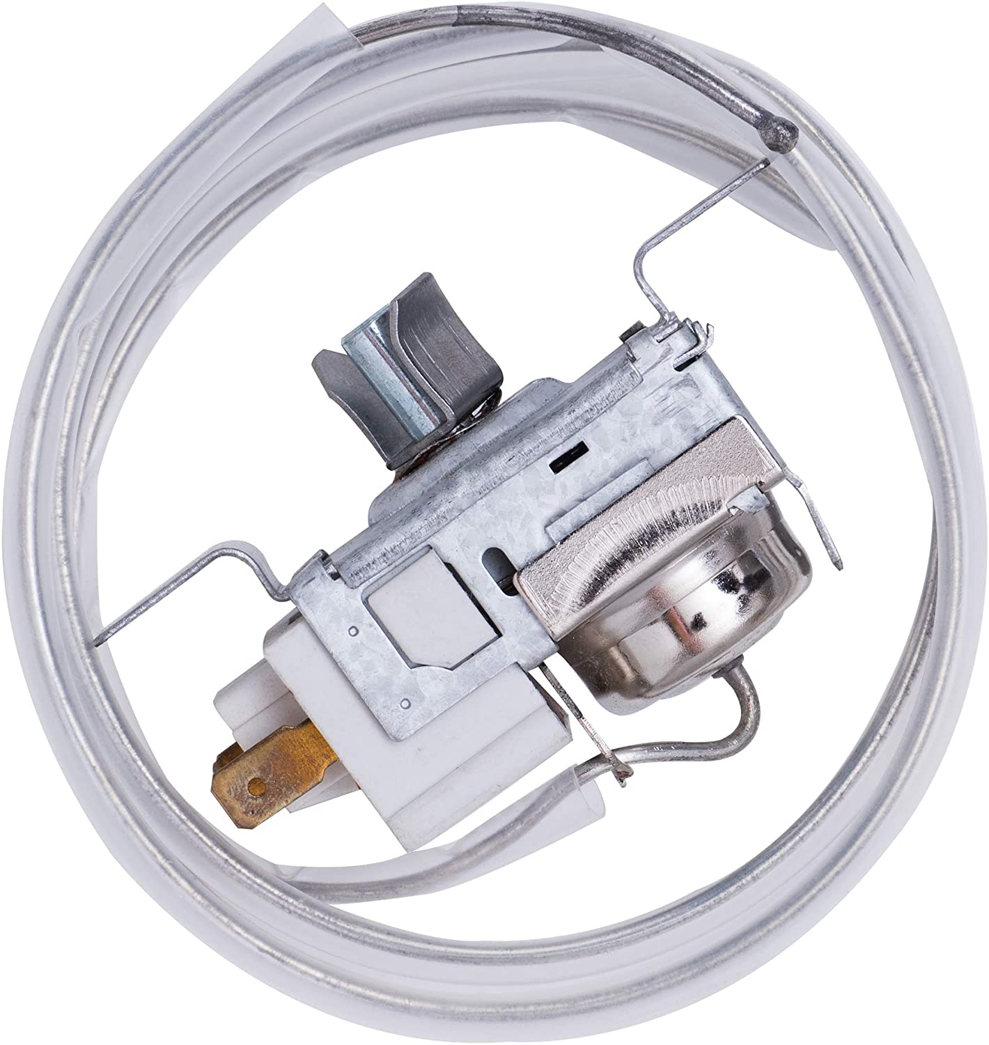 Replacement temperature control thermostat used on some Amana, Crosley, Estate, Ikea, Inglis, Kenmore, KitchenAid, Maytag, Roper, and Whirlpool refrigerator models.