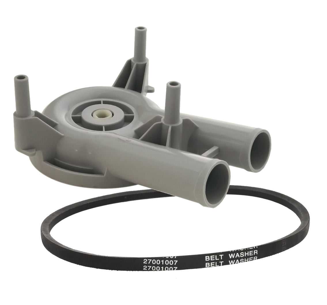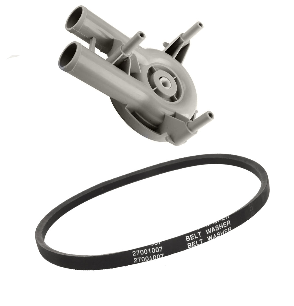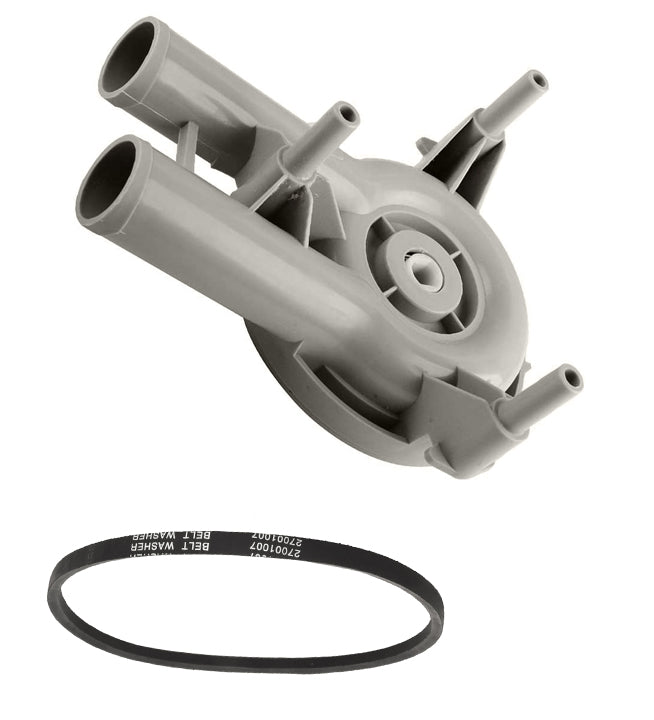 Replacement drain pump and drive belt used on some Whirlpool, Amana, Crosley, Maytag and Speed Queen washer models.