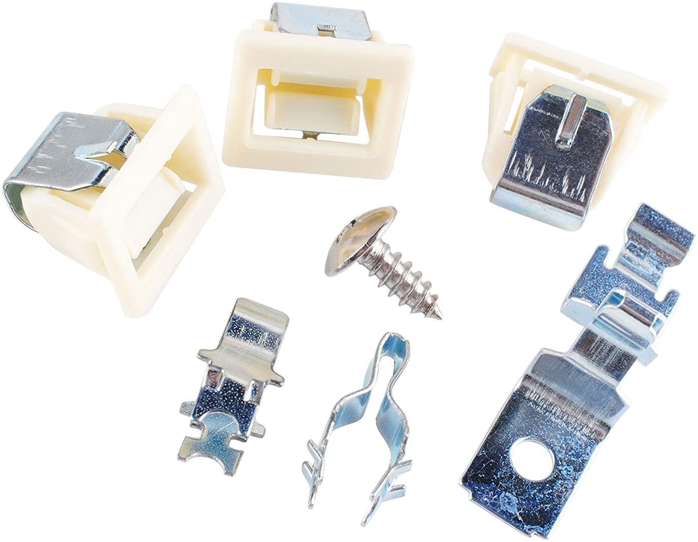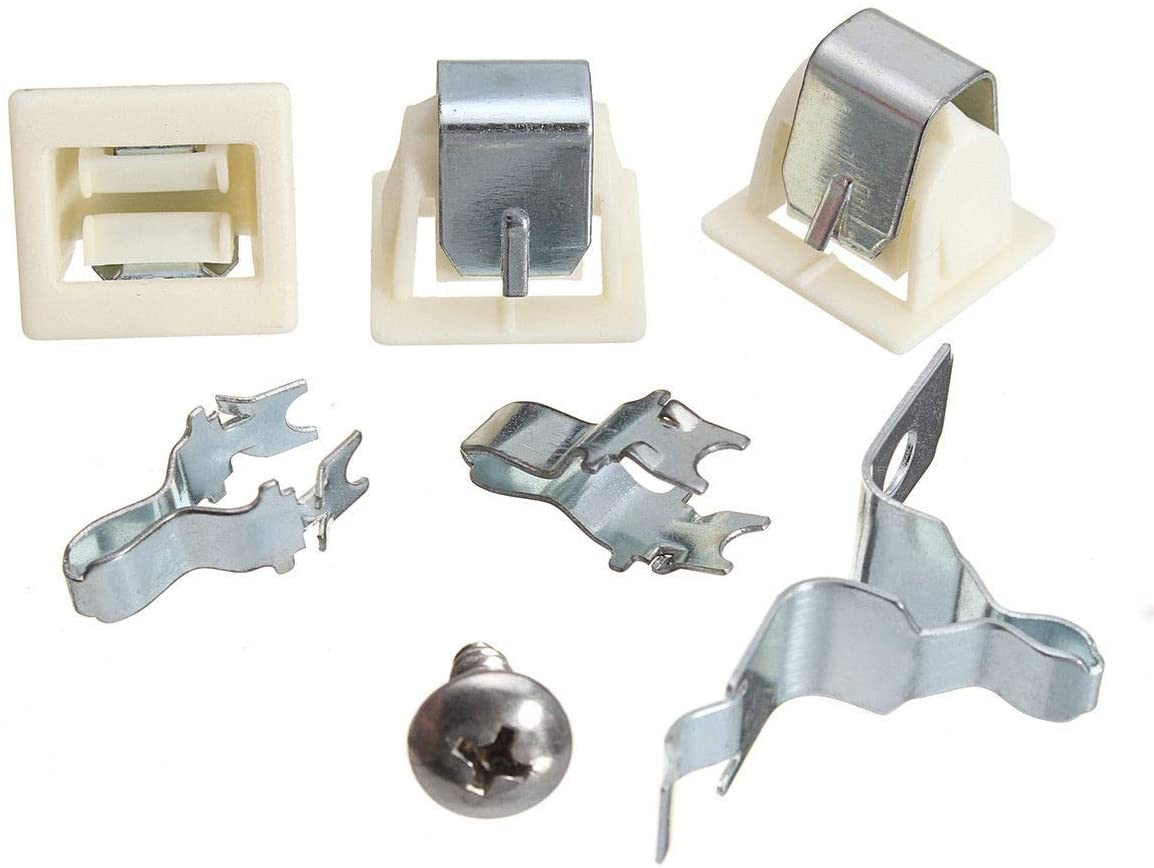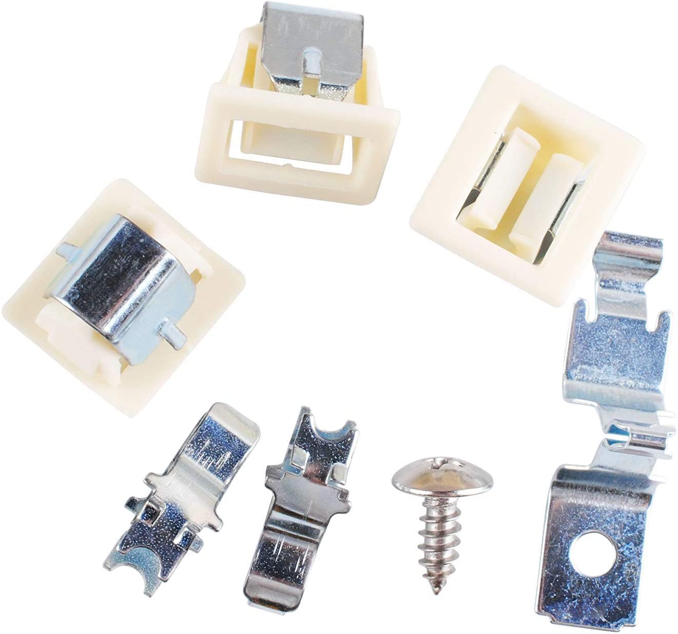 Replacement door latch and strike kit used on some Admiral, Amana, Crosley, Estate, Inglis, Kenmore, KitchenAid, Magic Chef, Maytag, Roper, and Whirlpool dryer models.