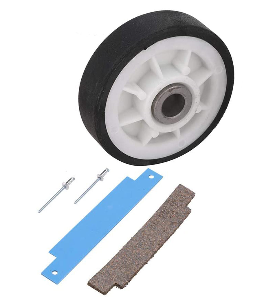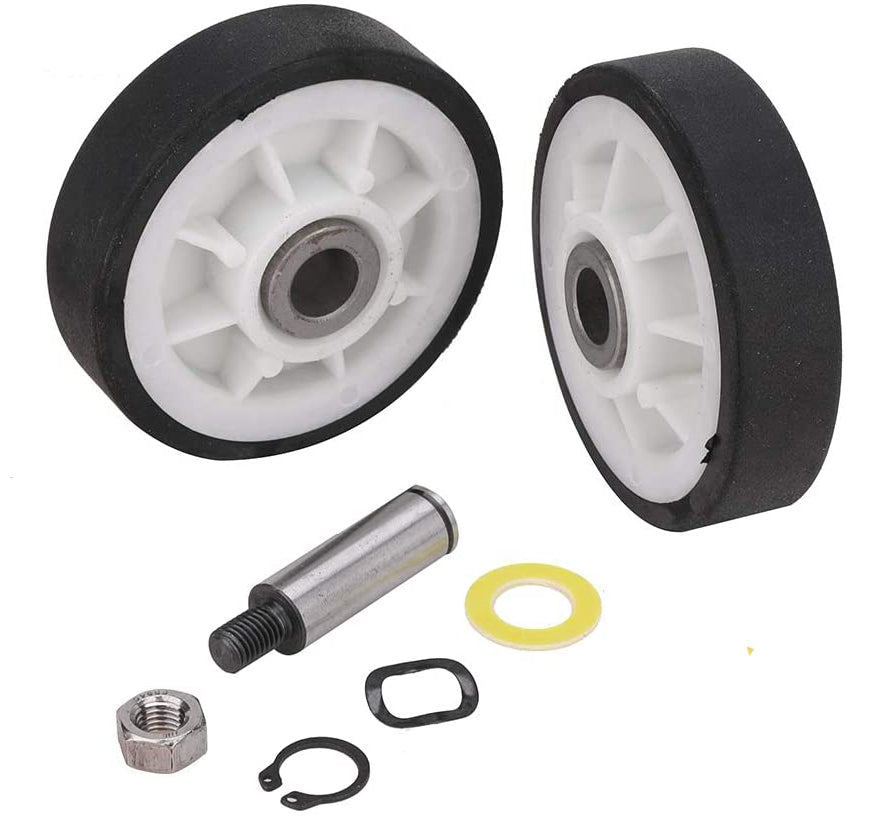 Replacement front drum roller and glide kit used on some Maytag, Magic Chef, Amana, Speed Queen, Jenn-Air, Sears Kenmore dryer models.
