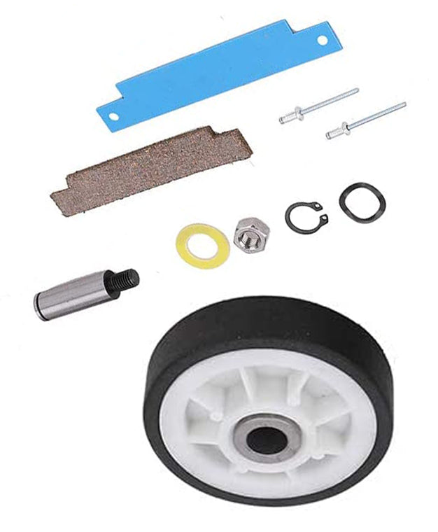 - Kit includes (2) rollers, (2) roller shafts and nuts, (2) washers, (2) retainer clips, (2) cork pads, (2) glides, and (4) rivets.