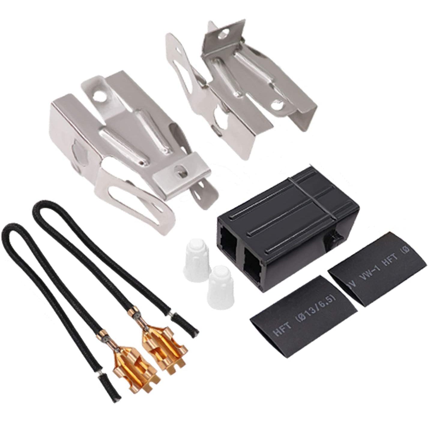 - Receptacle block (approx. 2"L x 1.25"W), Metal brackets (approx. 2.3"L x 1.3"W), Hi-temp wire leads (approx. 7"L), Wire connectors, Heat shrink insulators (approx. 1.25"L x .75"W).