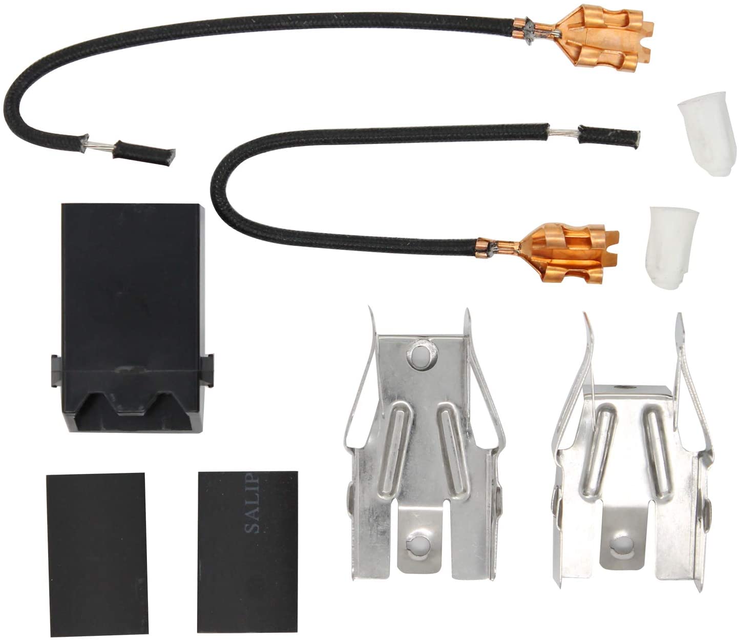 - Includes (1) plastic receptacle block (approx. 2"L x 1.25"W), (2) metal brackets (approx. 2.3"L x 1.3"W), (2) hi-temp wire leads (approx. 7"L), (2) wire connectors, and (2) heat shrink insulators (approx. 1.25"L x .75"W).