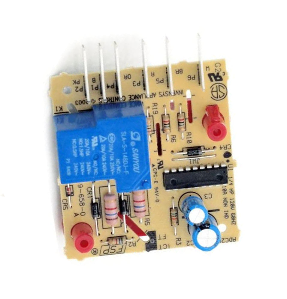 Replacement control board used on some Amana, Estate, Kenmore, KitchenAid, Maytag, Roper, and Whirlpool refrigerator models.