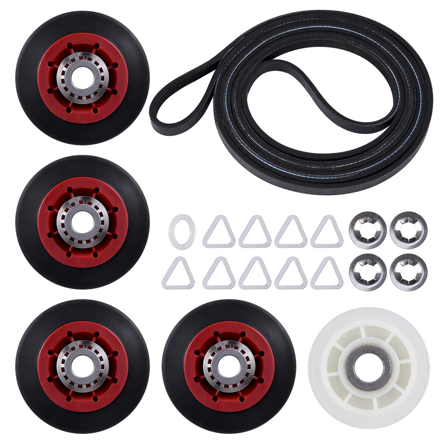 - Includes (1) 40111201 drum belt replacement, (4) W10314173 replacement rollers, washers, and tri-ring sets, and (1) 279640 idler pulley and tri-ring replacements.