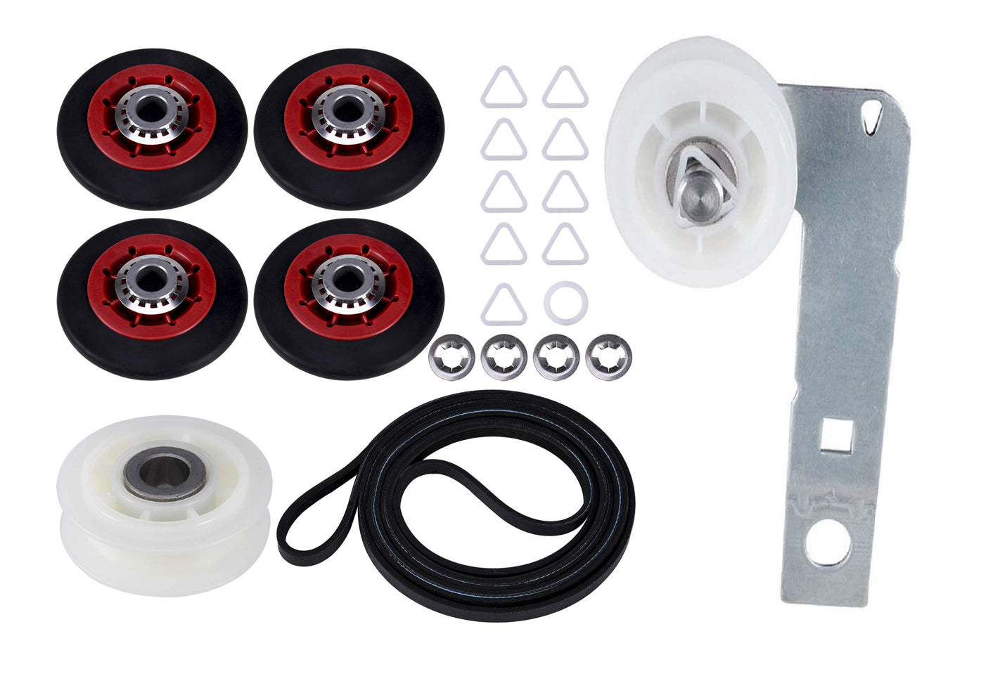 Replacement roller wheels, belt, idler pulley and pulley arm used to repair some Whirlpool, Admiral, Inglis, Kenmore and Maytag brand dryer models.