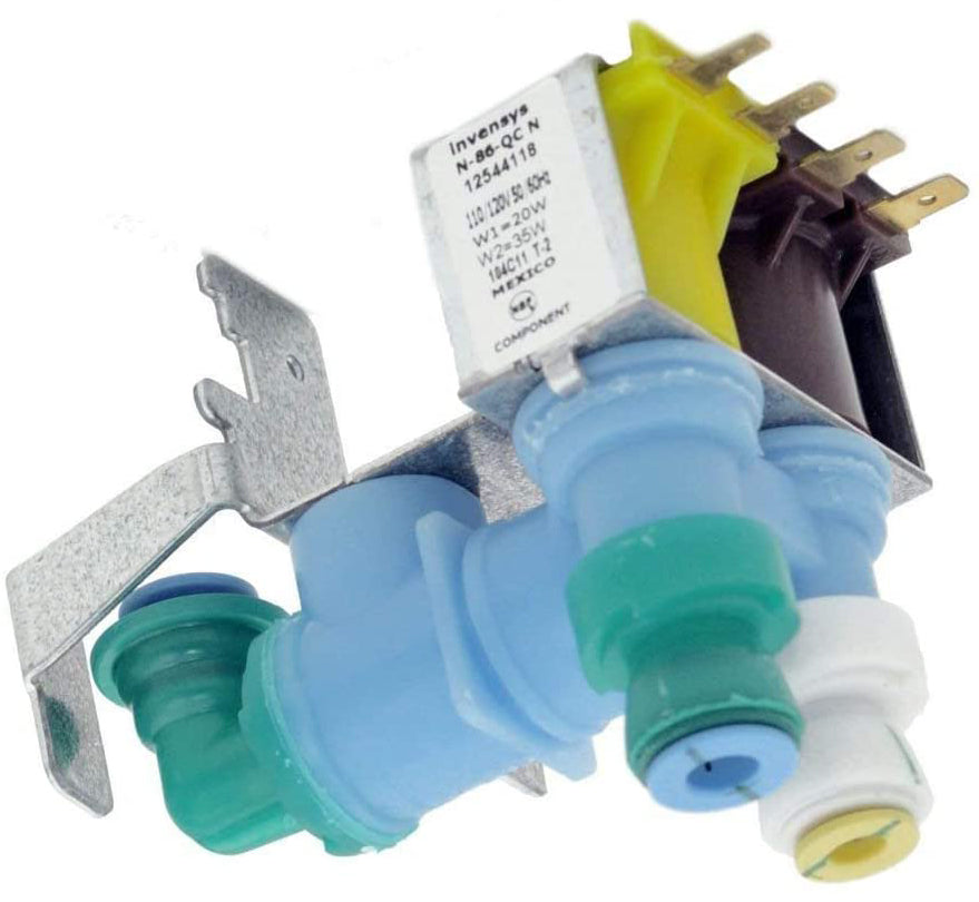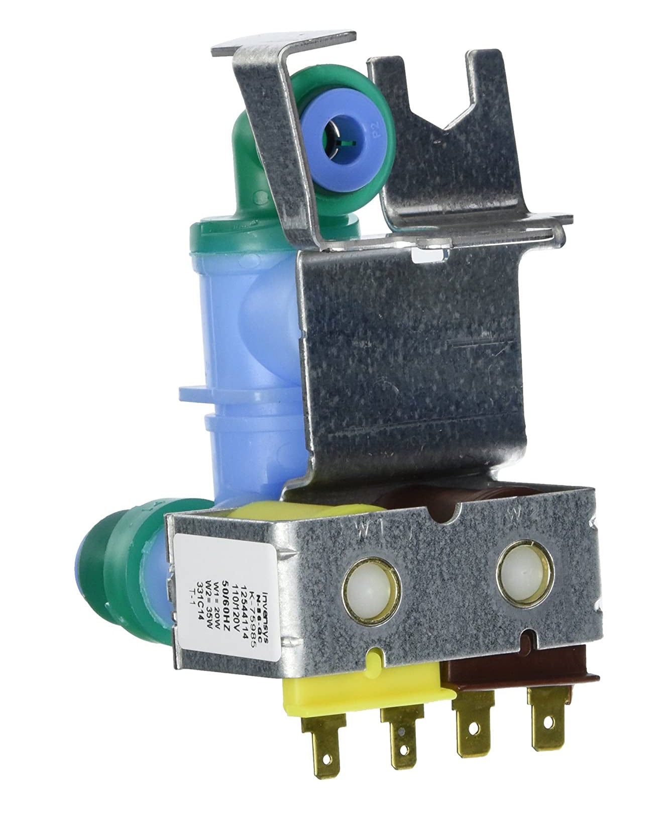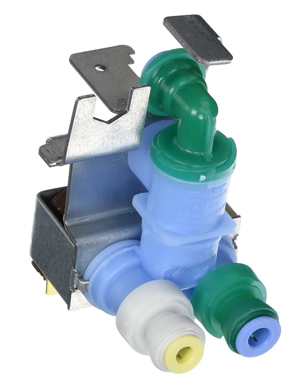 Replacement water inlet valve used on some Admiral, Amana, Crosley, Jenn-Air, Kenmore, KitchenAid, Maytag, and Whirlpool refrigerator models.