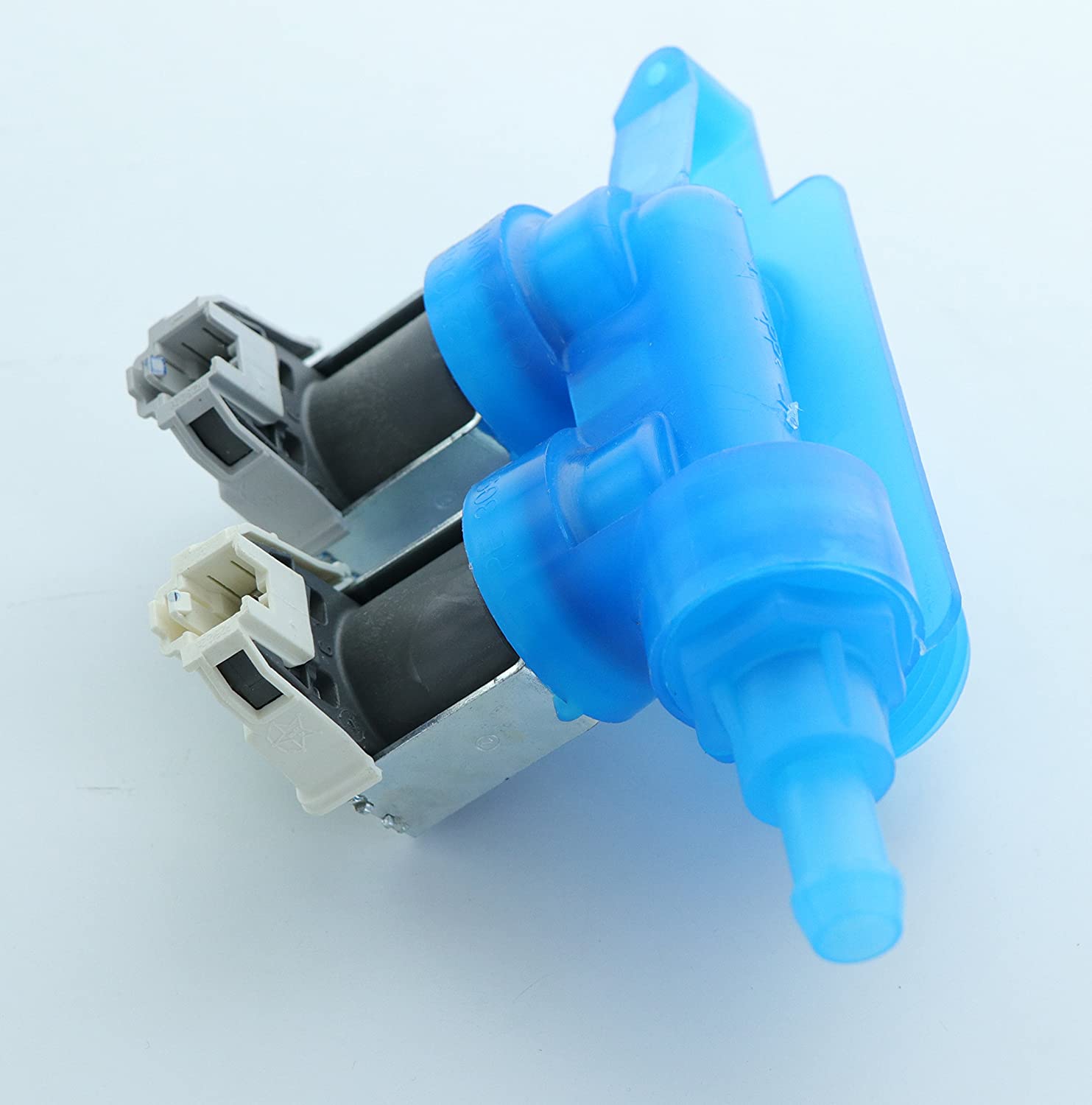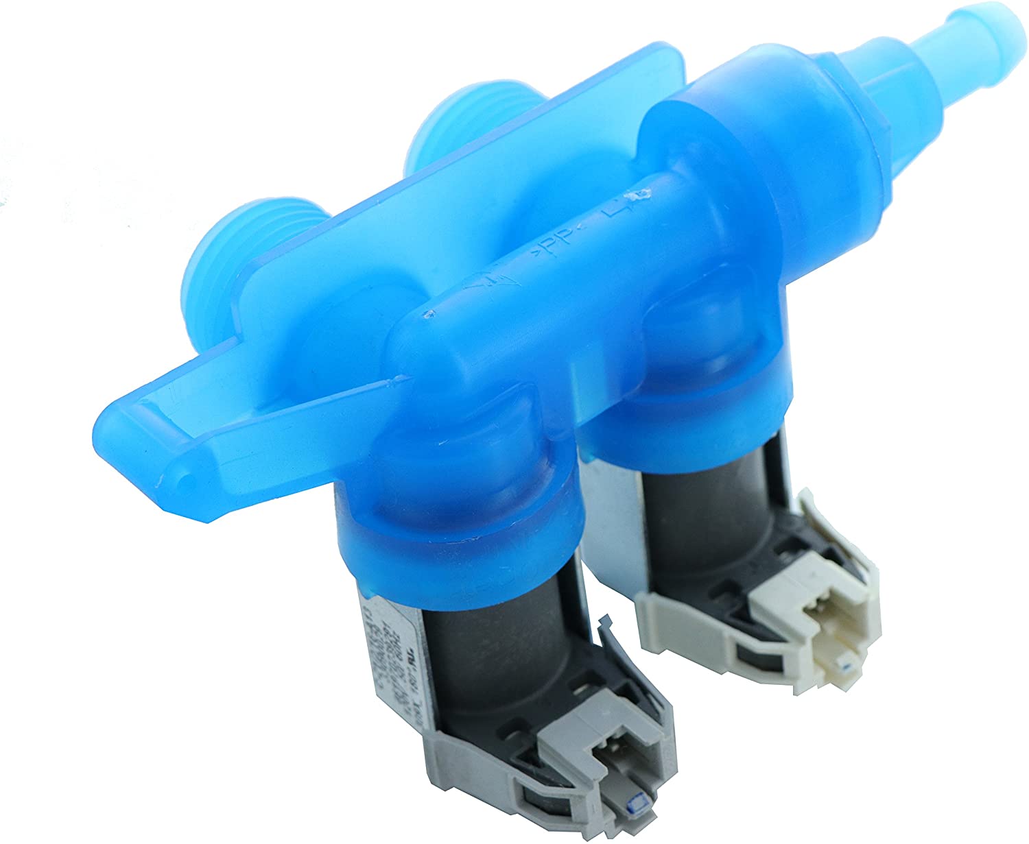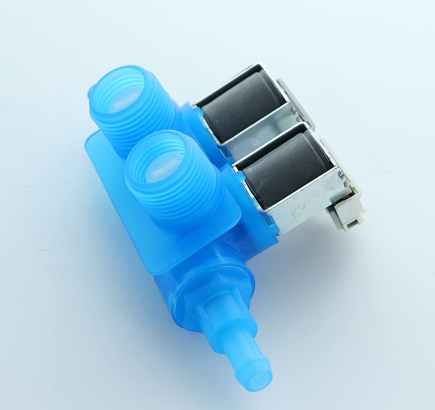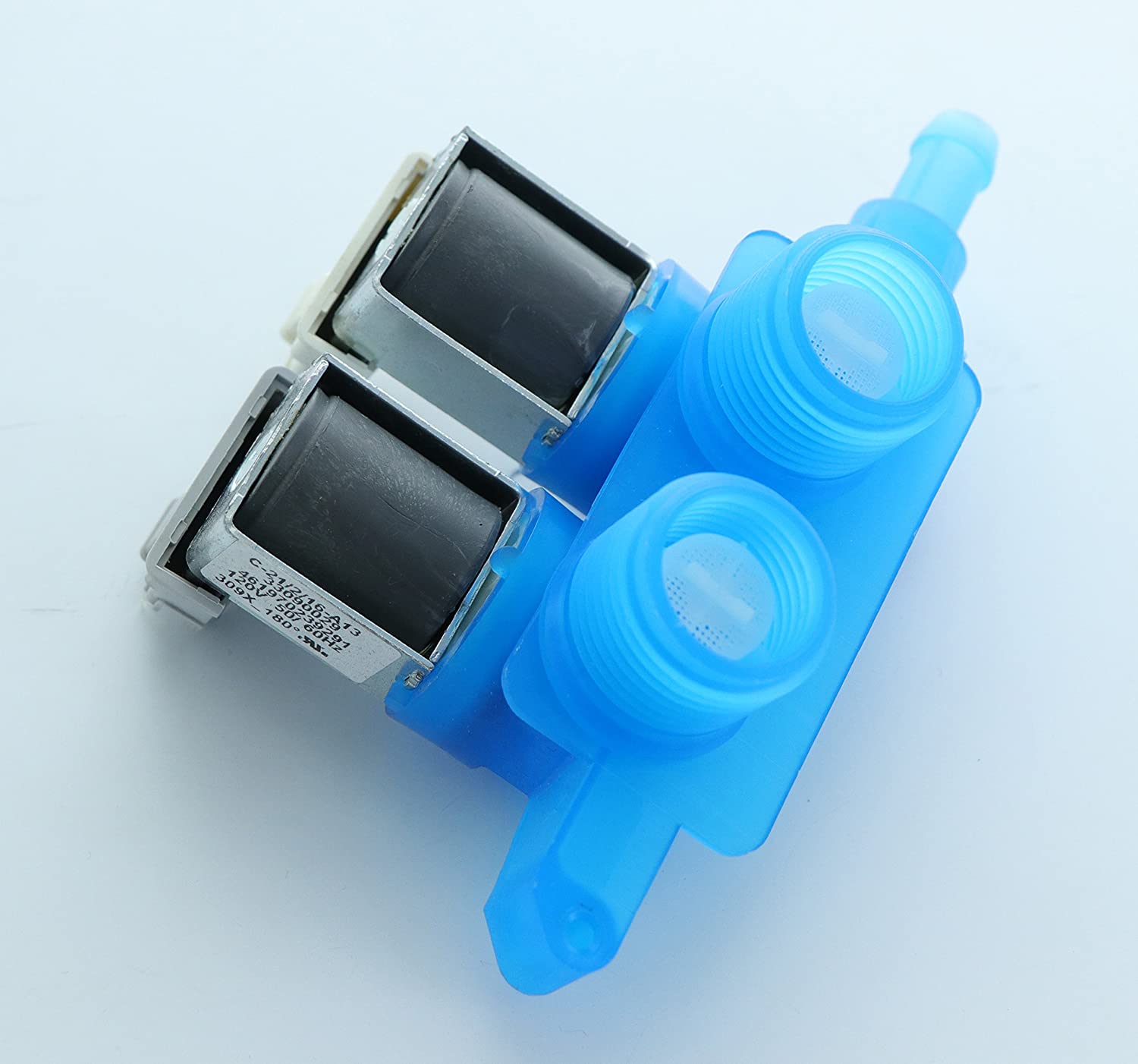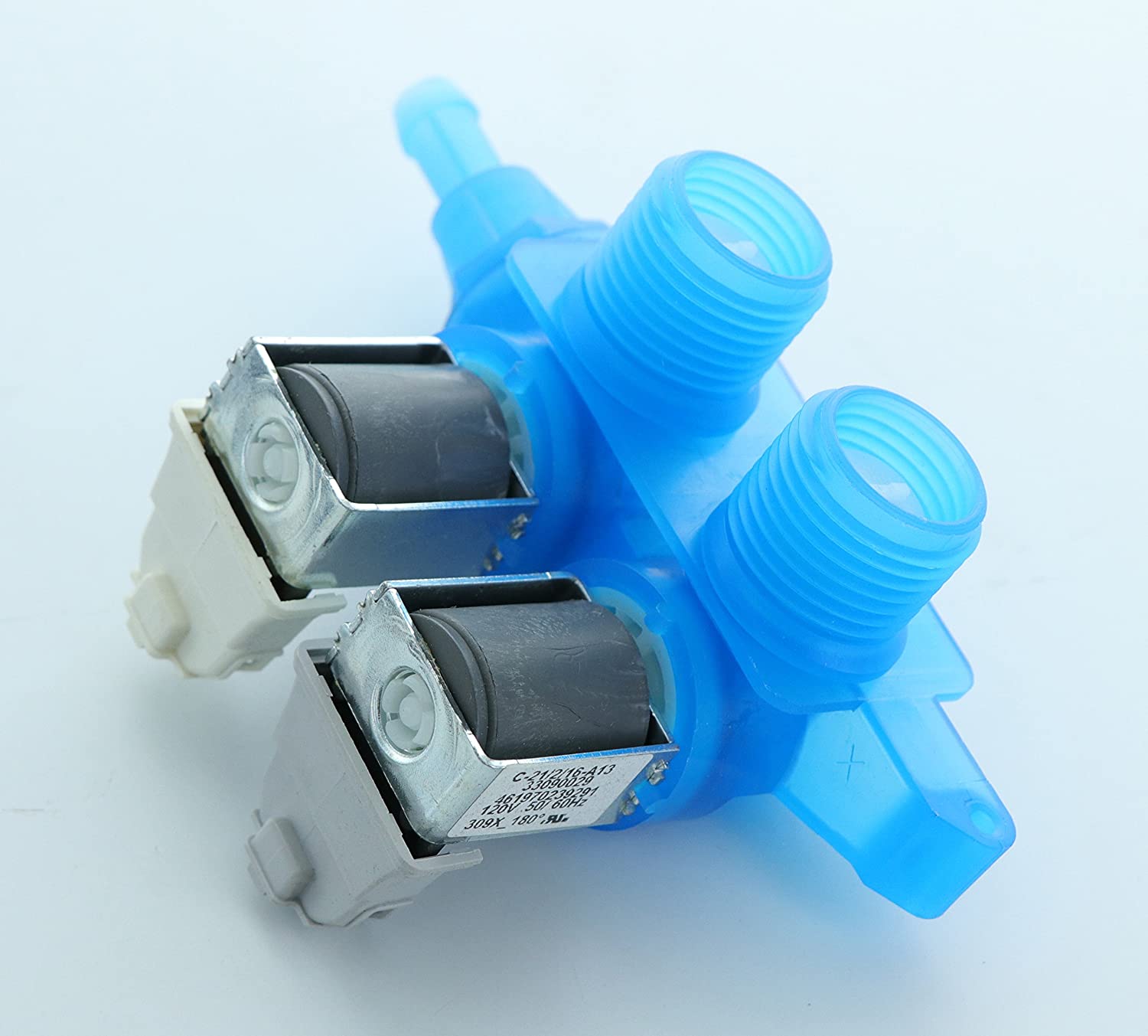 Replacement water inlet valve used on some Amana, Kenmore, KitchenAid, Maytag, and Whirlpool washer models.