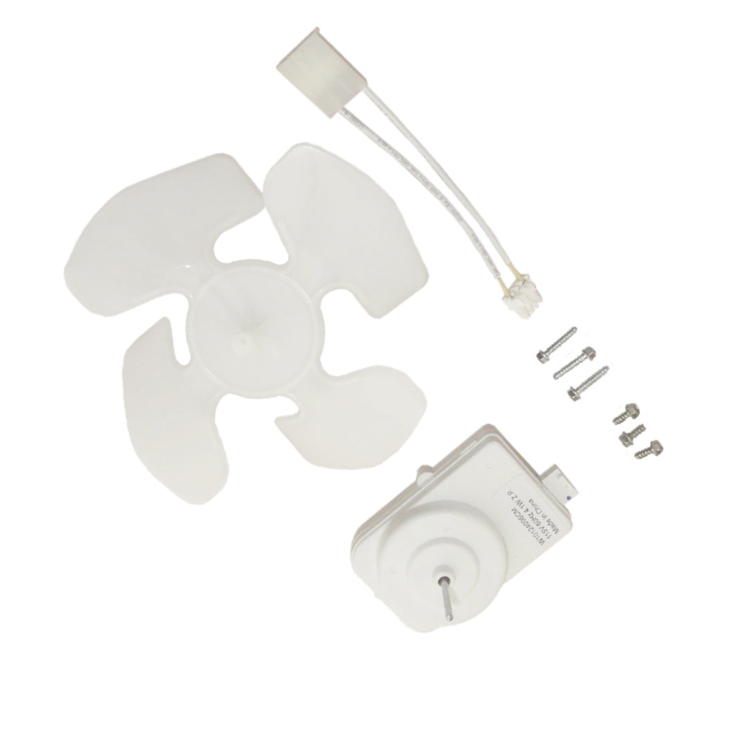 Replacement condenser fan motor kit used on some Amana, Crosley, Estate, Inglis, Jenn-Air, Kenmore, KitchenAid, Maytag, Roper, and Whirlpool refrigerator models.