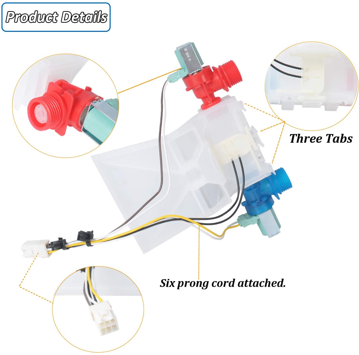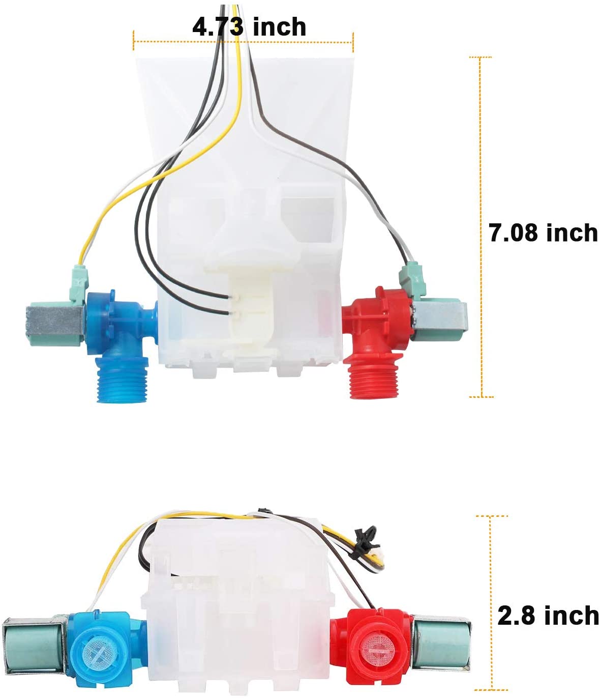 Replacement water inlet valve used in some Admiral, Amana, Crosley, Estate, Inglis, Kenmore, Maytag, Roper, and Whirlpool washer models.