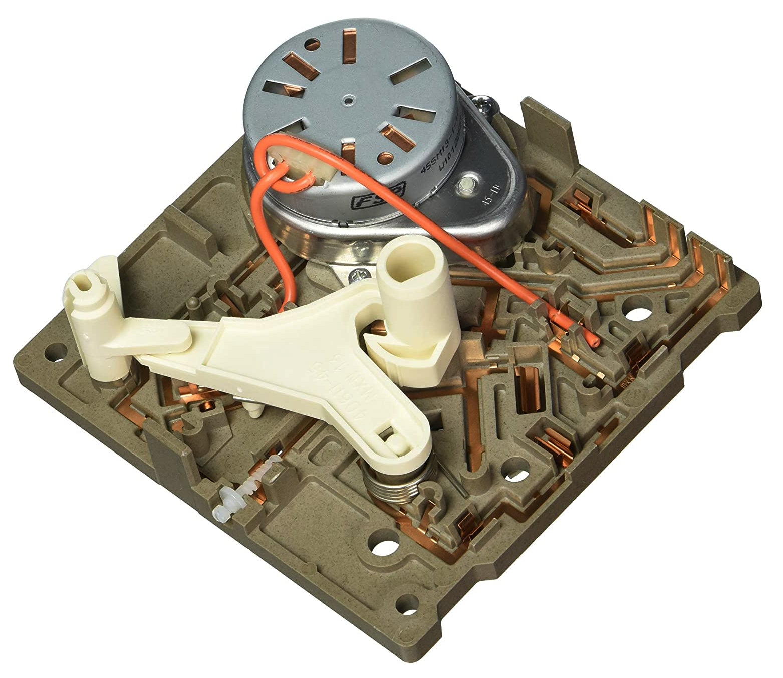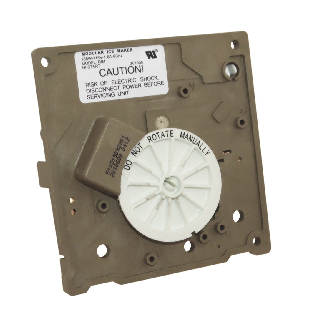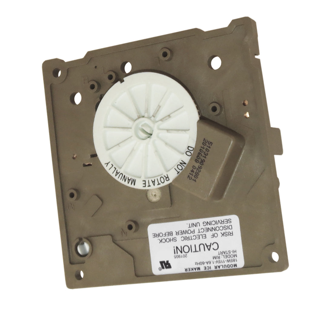 Replacement ice maker module and motor assembly used on some Admiral, Amana, Caloric, Crosley, Estate, Inglis, Jenn Air, Kenmore, KitchenAid, Magic Chef, Maytag, Norge, Roper, and Whirlpool refrigerator models.