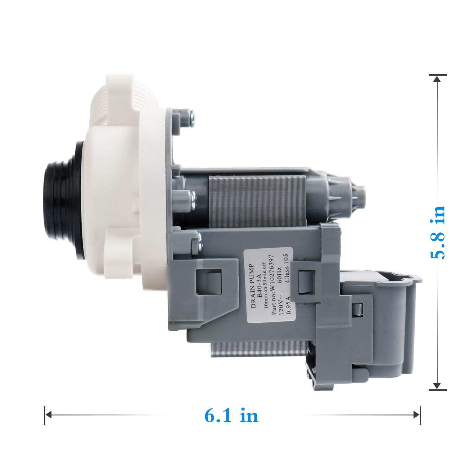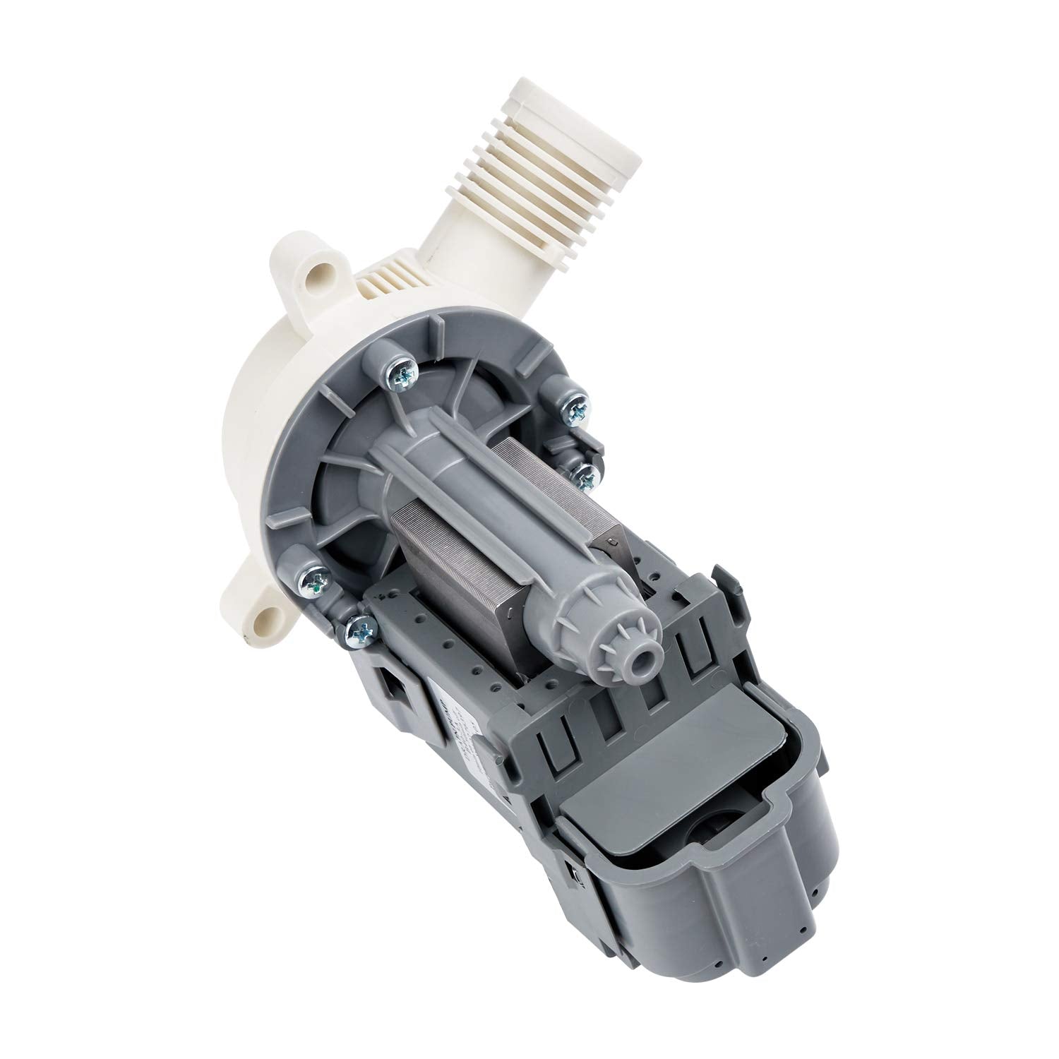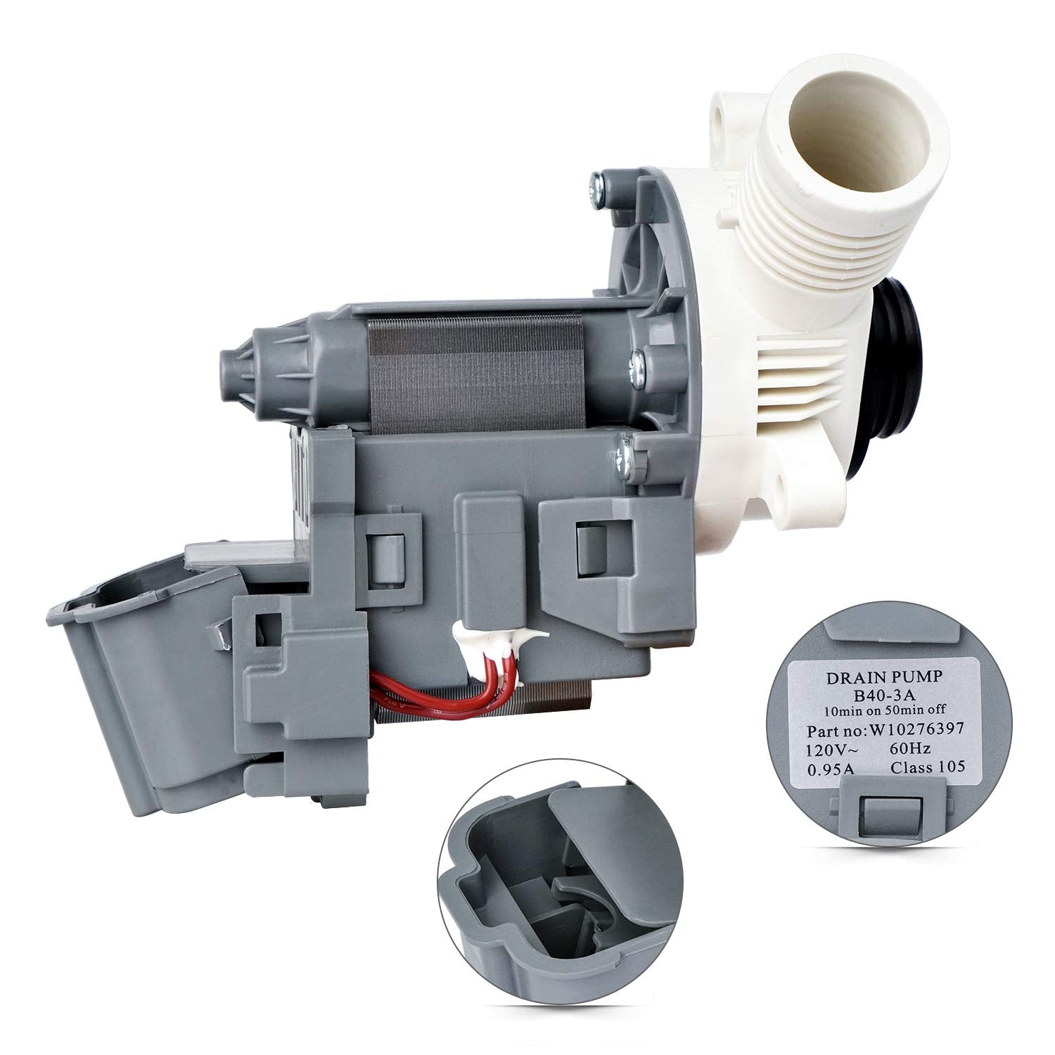 Replacement drain pump used on some Amana, Crosley, Inglis, Kenmore, Maytag, Roper and Whirlpool washer models.