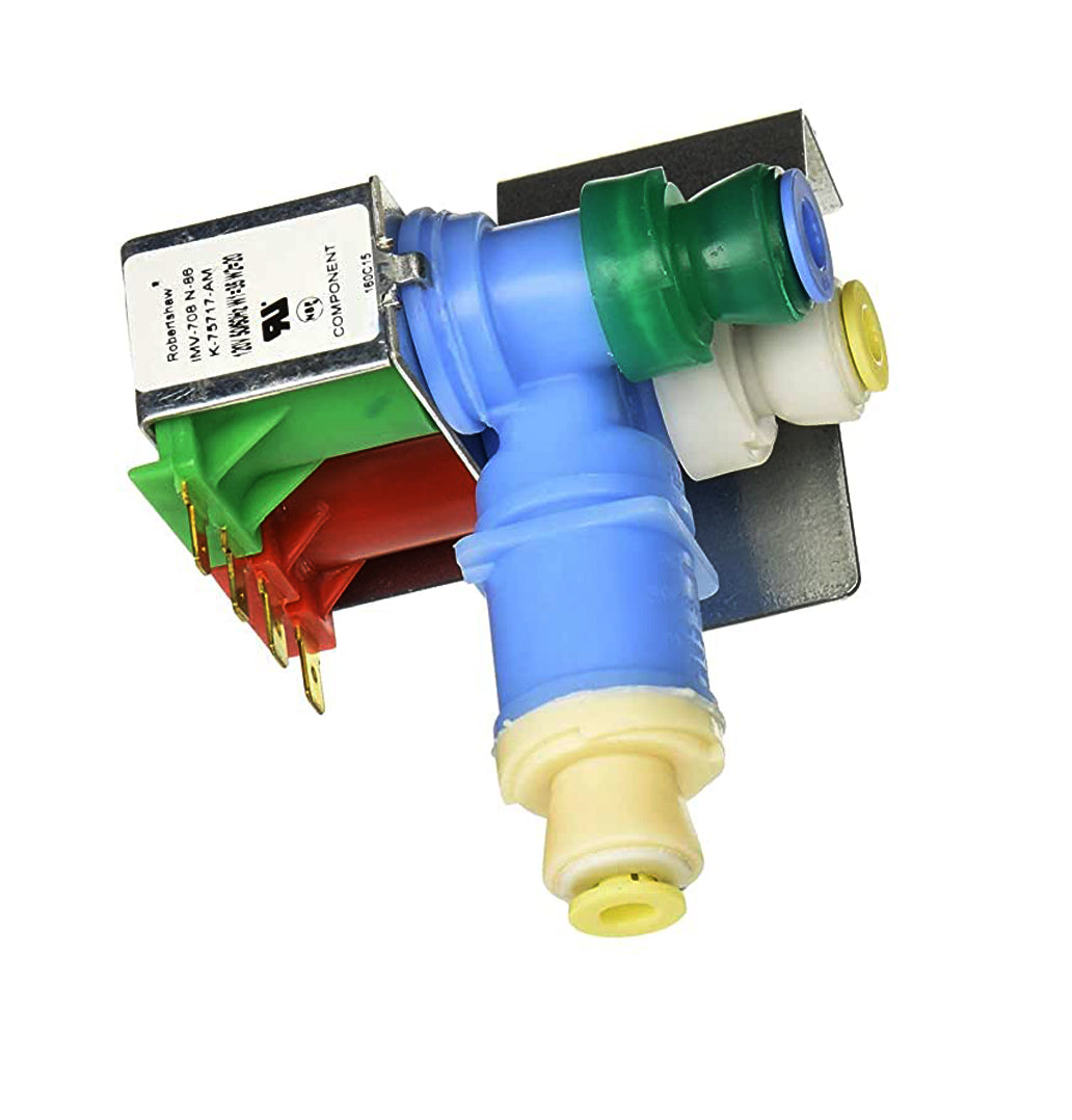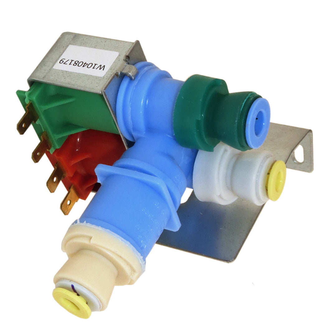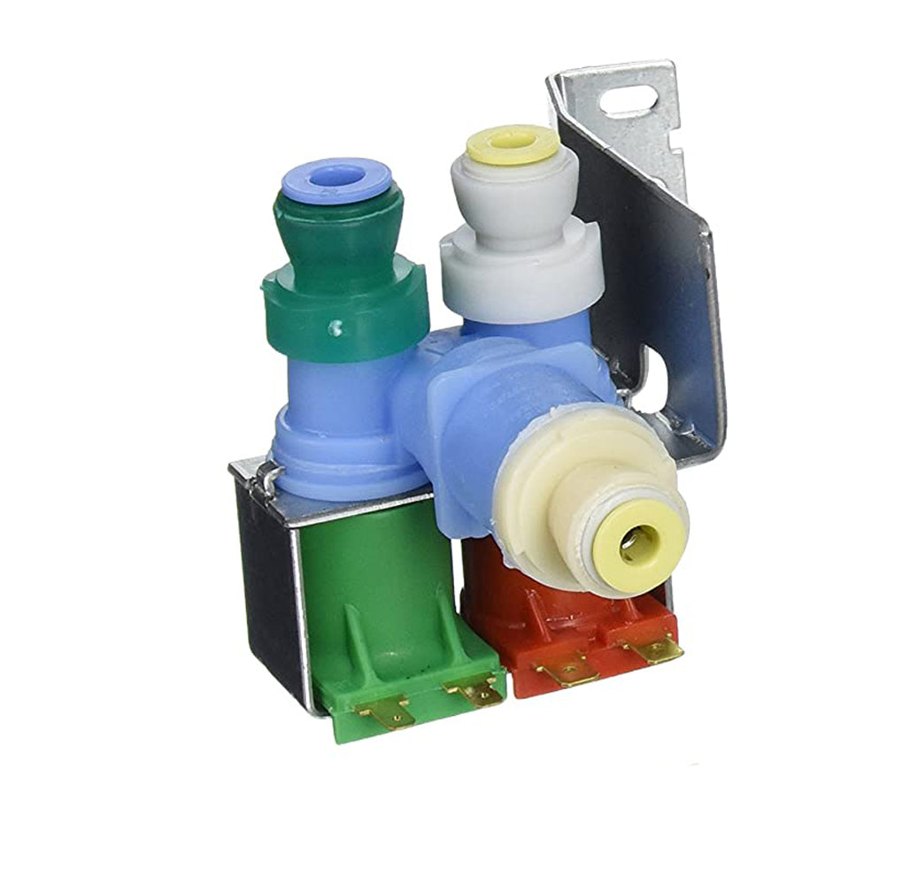 Replacement water inlet valve used on some Amana, Crosley, Estate, Inglis, Kenmore, KitchenAid, Maytag, Roper, and Whirlpool refrigerator models.