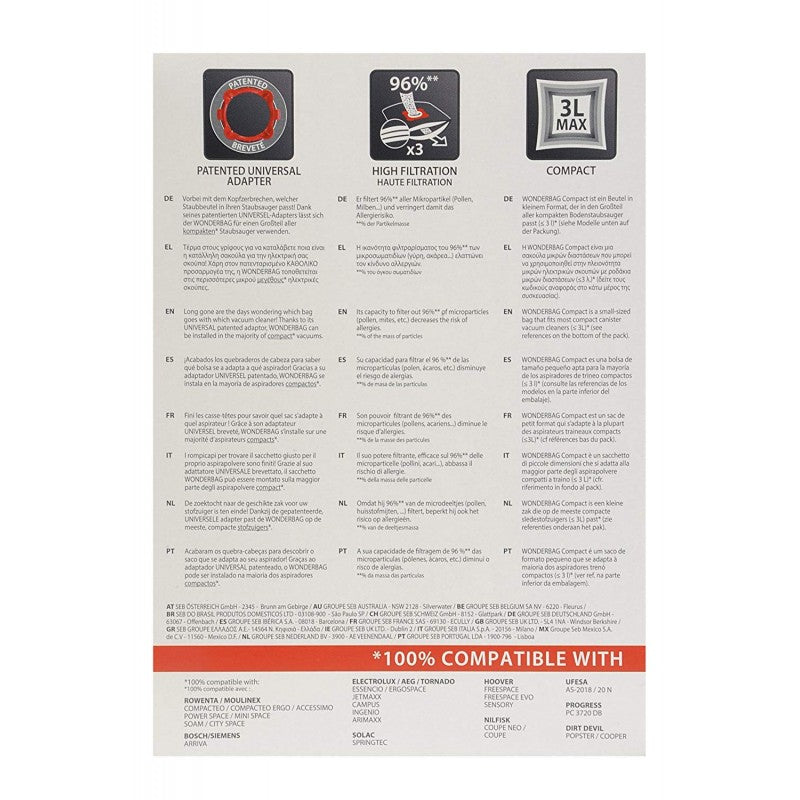 Model Brand: ROWENTA/MOULINEX (COMPACTEO - COMPACTEO ERGO, ACCESSIMO - POWER SPACE, MINI SPACE - CITY SPACE - SOAM), BOSCH SIEMENS (ARRIVA), ELECTROLUX / AEG / TORNADO (ESSENCIO - ERGOSPACE - JETMAXX, CAMPUS - INGENIO - ARIMAX), HOOVER (FREESPACE - SENSORY)
